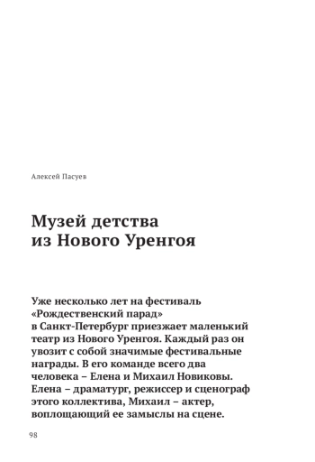 Уже несколько лет на фестиваль «Рождественский парад» в Санкт-Петербург приезжает маленький театр из Нового Уренгоя. Каждый раз он увозит с собой значимые фестивальные награды. В его команде всего два человека – Елена и Михаил Новиковы. Елена – драматург, режиссер и сценограф этого коллектива, Михаил – актер, воплощающий ее замыслы на сцене.