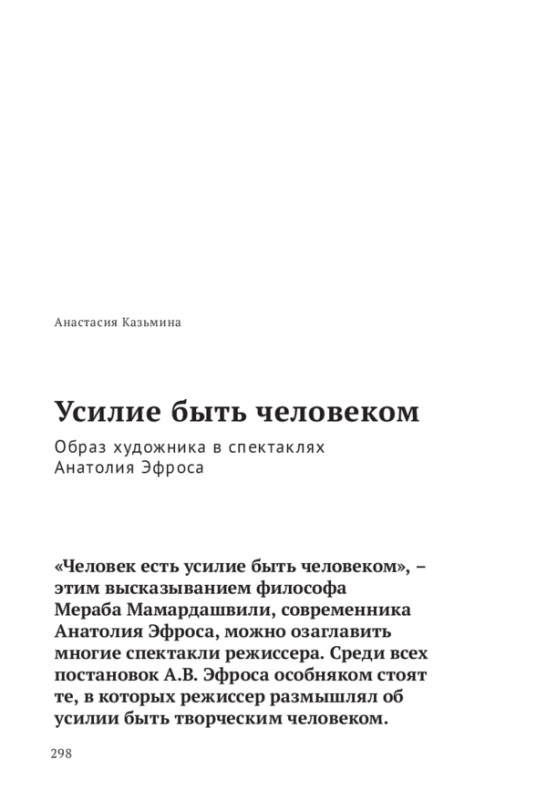 «Человек есть усилие быть человеком», – этим высказыванием философа Мераба Мамардашвили, современника Анатолия Эфроса, можно озаглавить многие спектакли режиссера. Среди всех постановок А. В. Эфроса особняком стоят те, в которых режиссер размышлял об усилии быть творческим человеком.