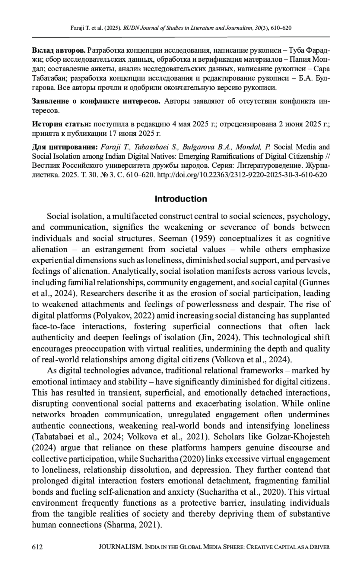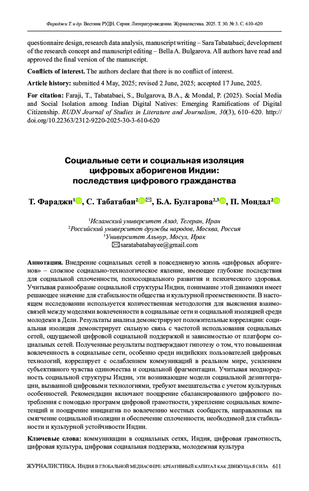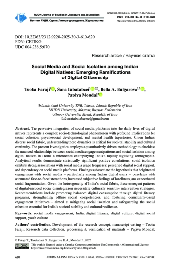 Внедрение социальных сетей в повседневную жизнь «цифровых аборигенов» – сложное социально-технологическое явление, имеющее глубокие последствия для социальной сплоченности, психосоциального развития и психического здоровья. Учитывая разнообразие социальной структуры Индии, понимание этой динамики имеет решающее значение для стабильности общества и культурной преемственности. В настоящем исследовании используется количественная методология для выяснения взаимосвязей между моделями вовлеченности в социальные сети и социальной изоляцией среди молодежи в Дели. Результаты анализа демонстрируют положительные корреляции: социальная изоляция демонстрирует сильную связь с частотой использования социальных сетей, ощущаемой цифровой социальной поддержкой и зависимостью от платформ социальных сетей. Полученные результаты подтверждают гипотезу о том, что повышенная вовлеченность в социальные сети, особенно среди индийских пользователей цифровых технологий, коррелирует с ослаблением коммуникаций в реальном мире, усилением субъективного чувства одиночества и социальной фрагментации. Учитывая неоднородность социальной структуры Индии, эти возникающие модели социальной дезинтеграции, вызванной цифровыми технологиями, требуют вмешательства с учетом культурных особенностей. Рекомендации включают поощрение сбалансированного цифрового потребления с помощью программ цифровой грамотности, укрепление социальных компетенций и поощрение инициатив по вовлечению местных сообществ, направленных на смягчение социальной изоляции и обеспечение сплоченности, необходимой для стабильности и культурной устойчивости Индии.