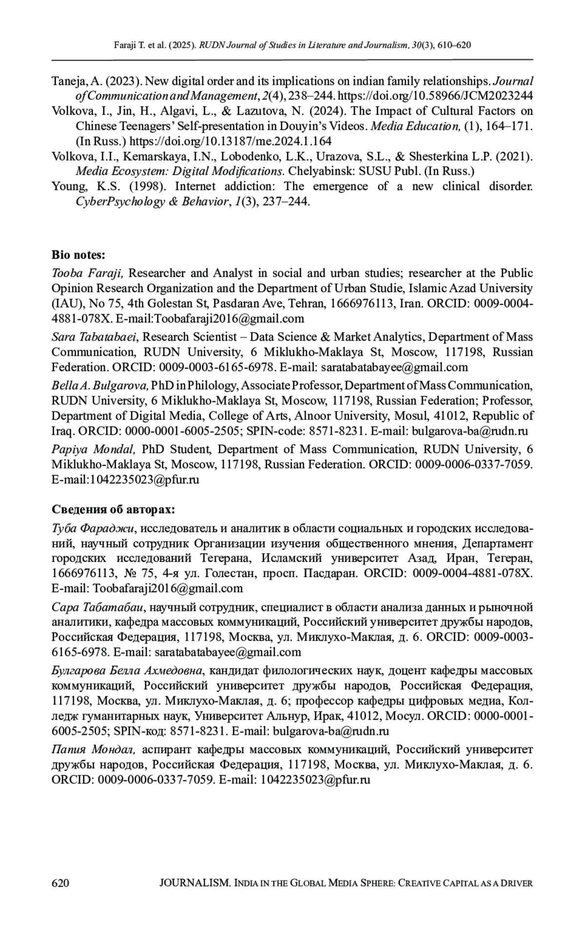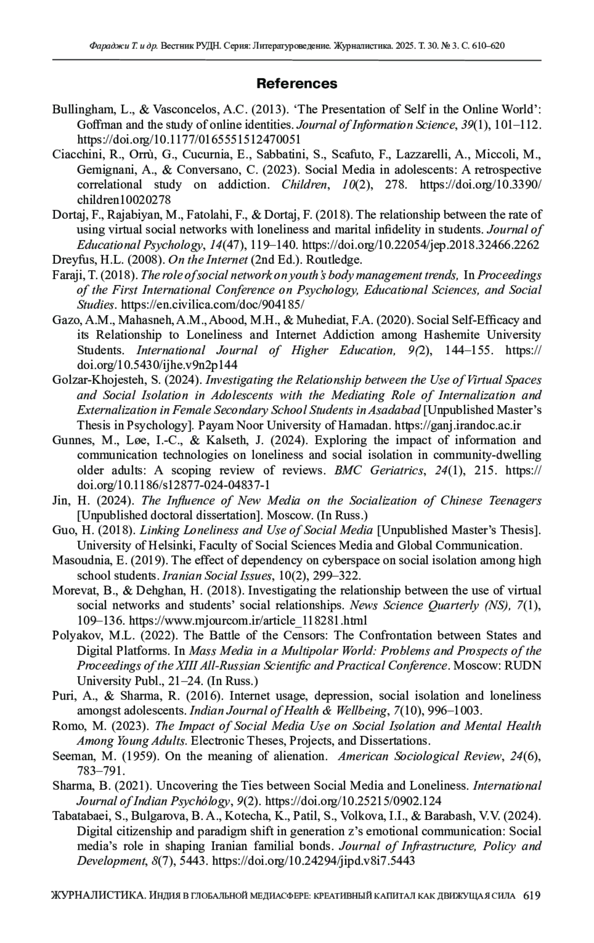18. Tabatabaei, S., Bulgarova, B. A., Kotecha, K., Patil, S., Volkova, I.I., & Barabash, V.V. (2024). Digital citizenship and paradigm shift in generation z’s emotional communication: Social media’s role in shaping Iranian familial bonds. Journal of Infrastructure, Policy and Development, 8(7), 5443. DOI: 10.24294/jipd.v8i7.5443 EDN: AABBWN