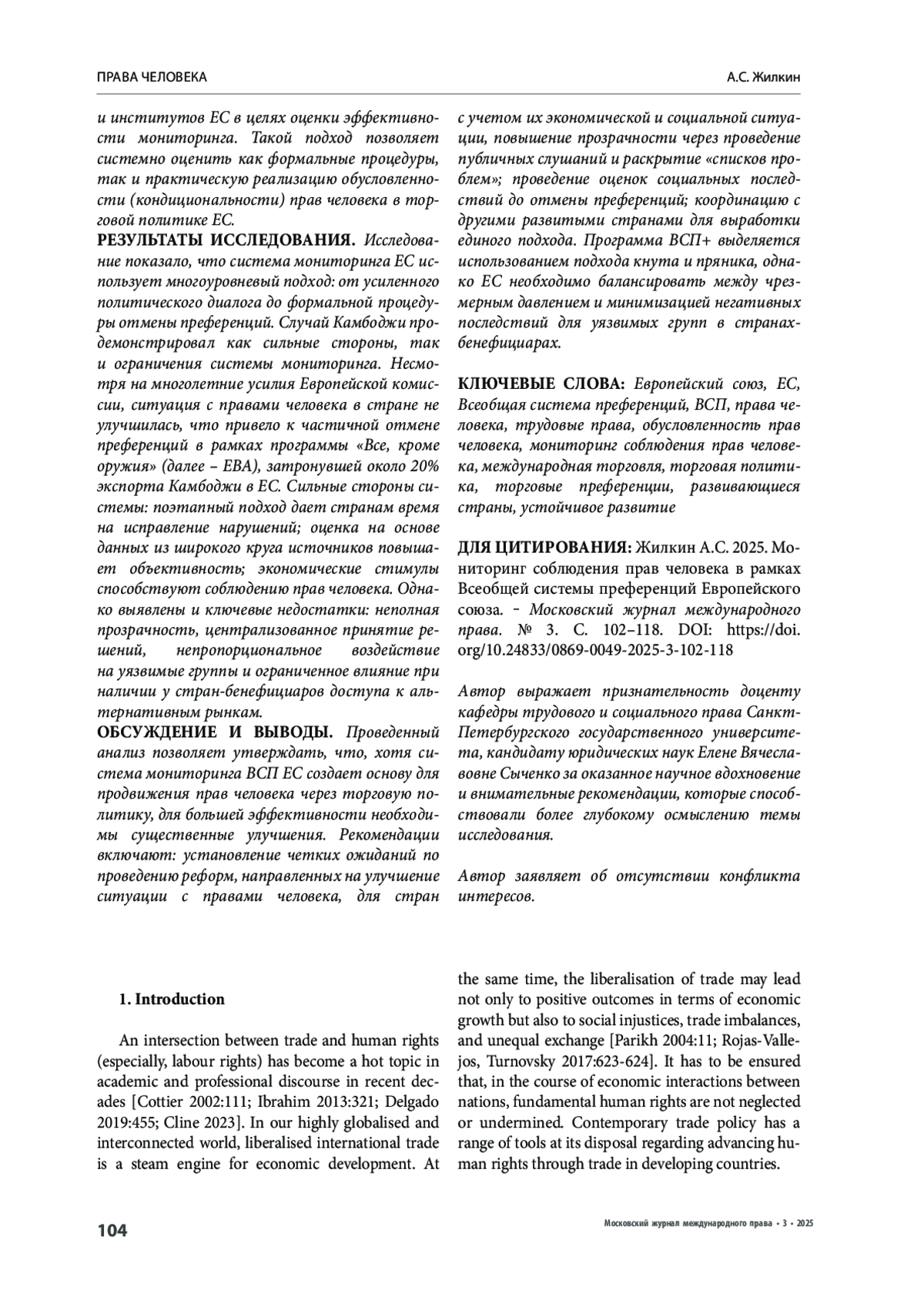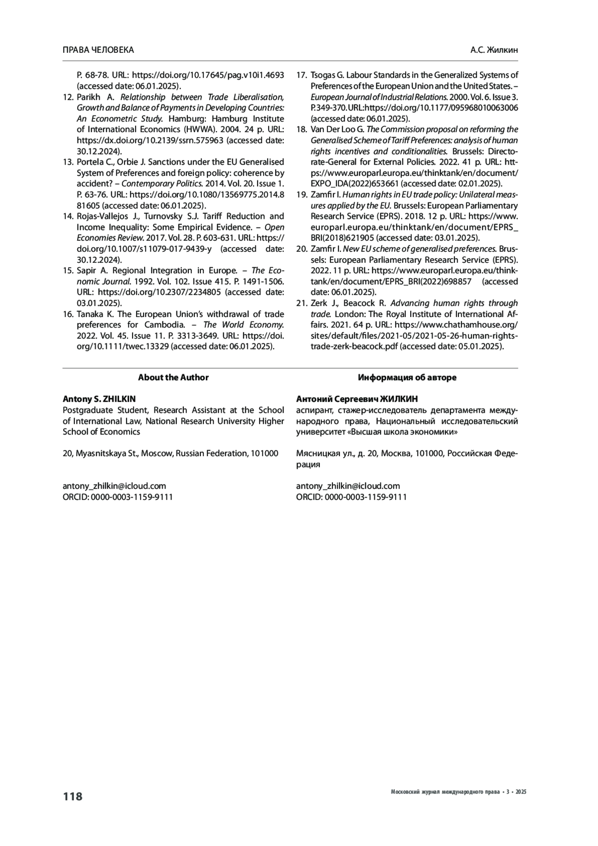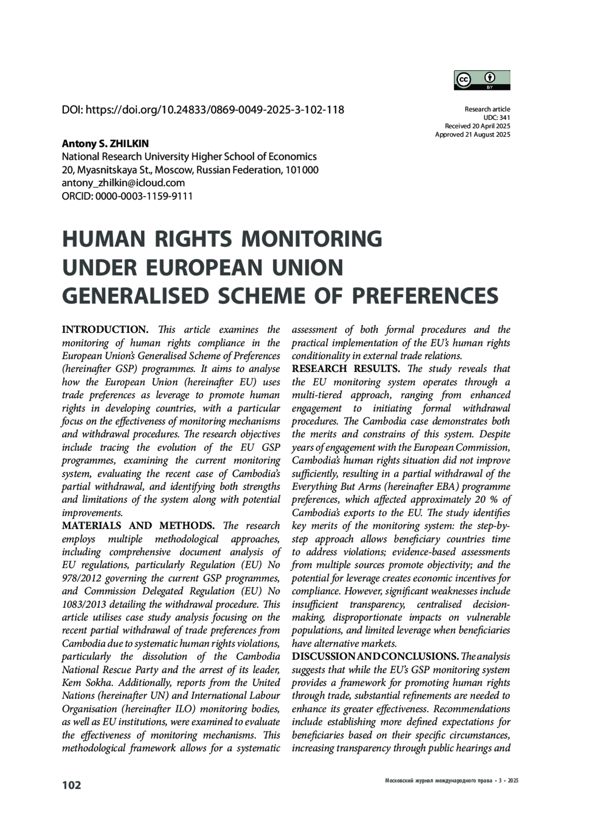ЖИЛКИН А. С. МОНИТОРИНГ СОБЛЮДЕНИЯ ПРАВ ЧЕЛОВЕКА В РАМКАХ ВСЕОБЩЕЙ СИСТЕМЫ ПРЕФЕРЕНЦИЙ ЕВРОПЕЙСКОГО СОЮЗА // МОСКОВСКИЙ ЖУРНАЛ МЕЖДУНАРОДНОГО ПРАВА. 2025. ВЫПУСК 3
