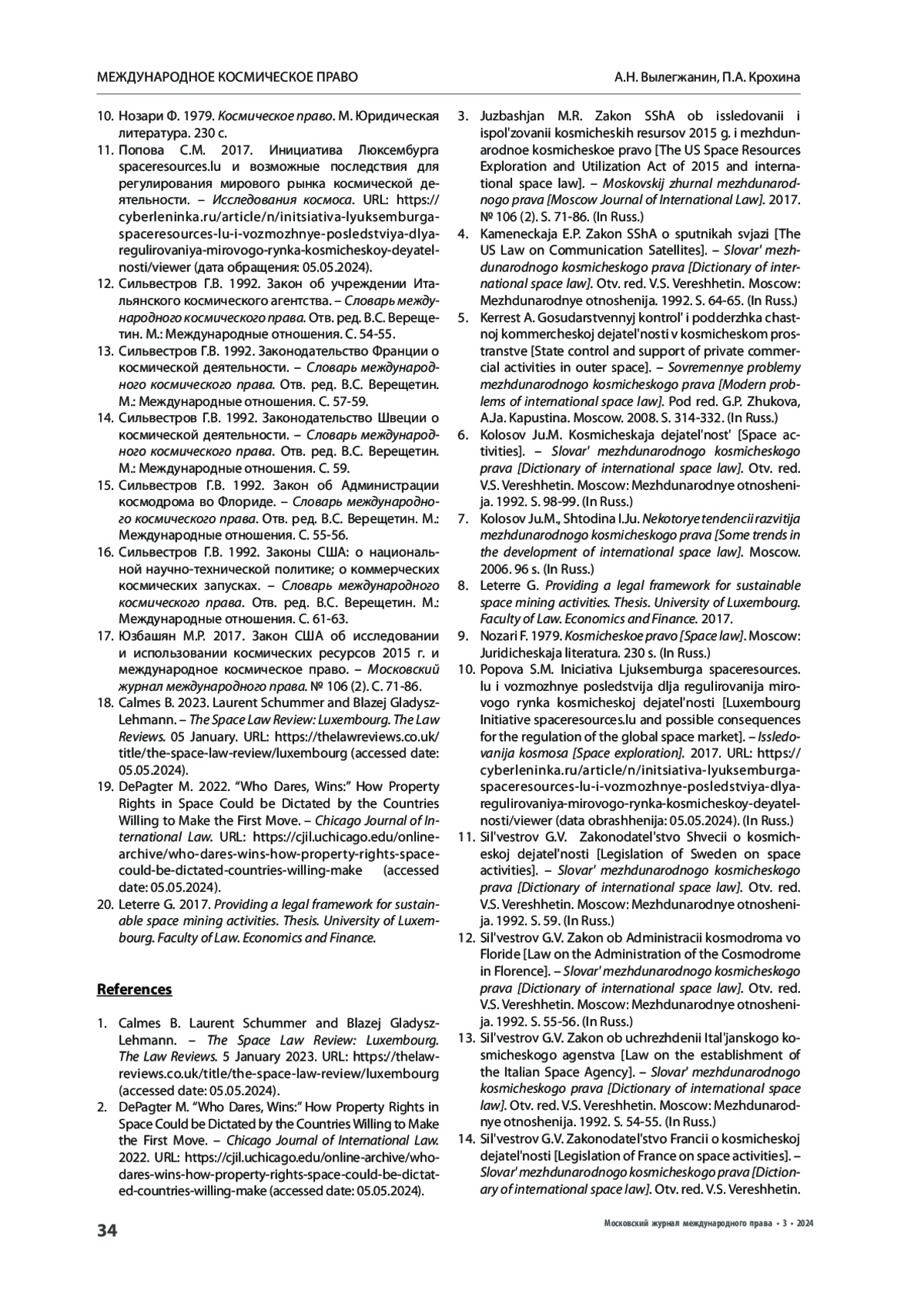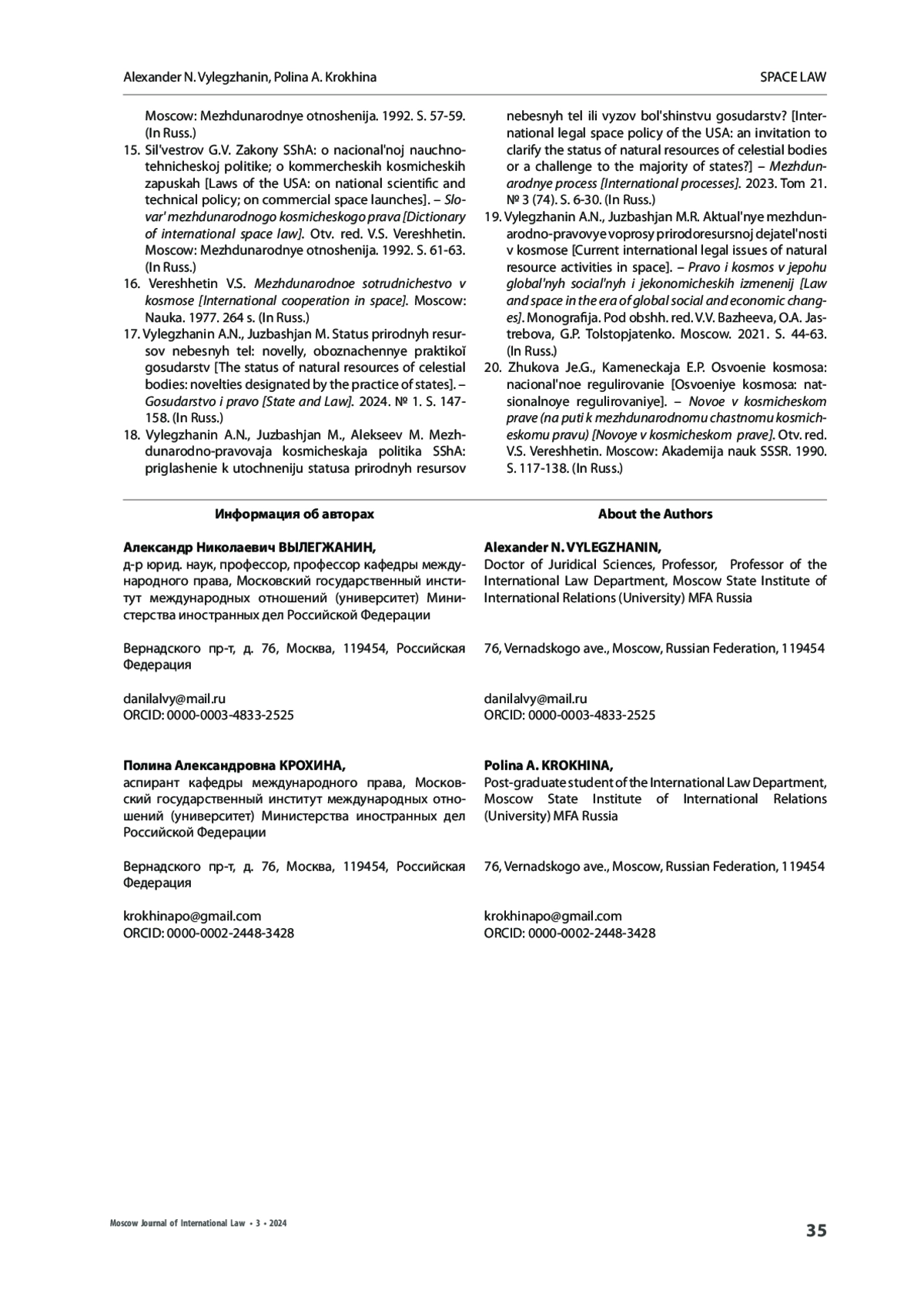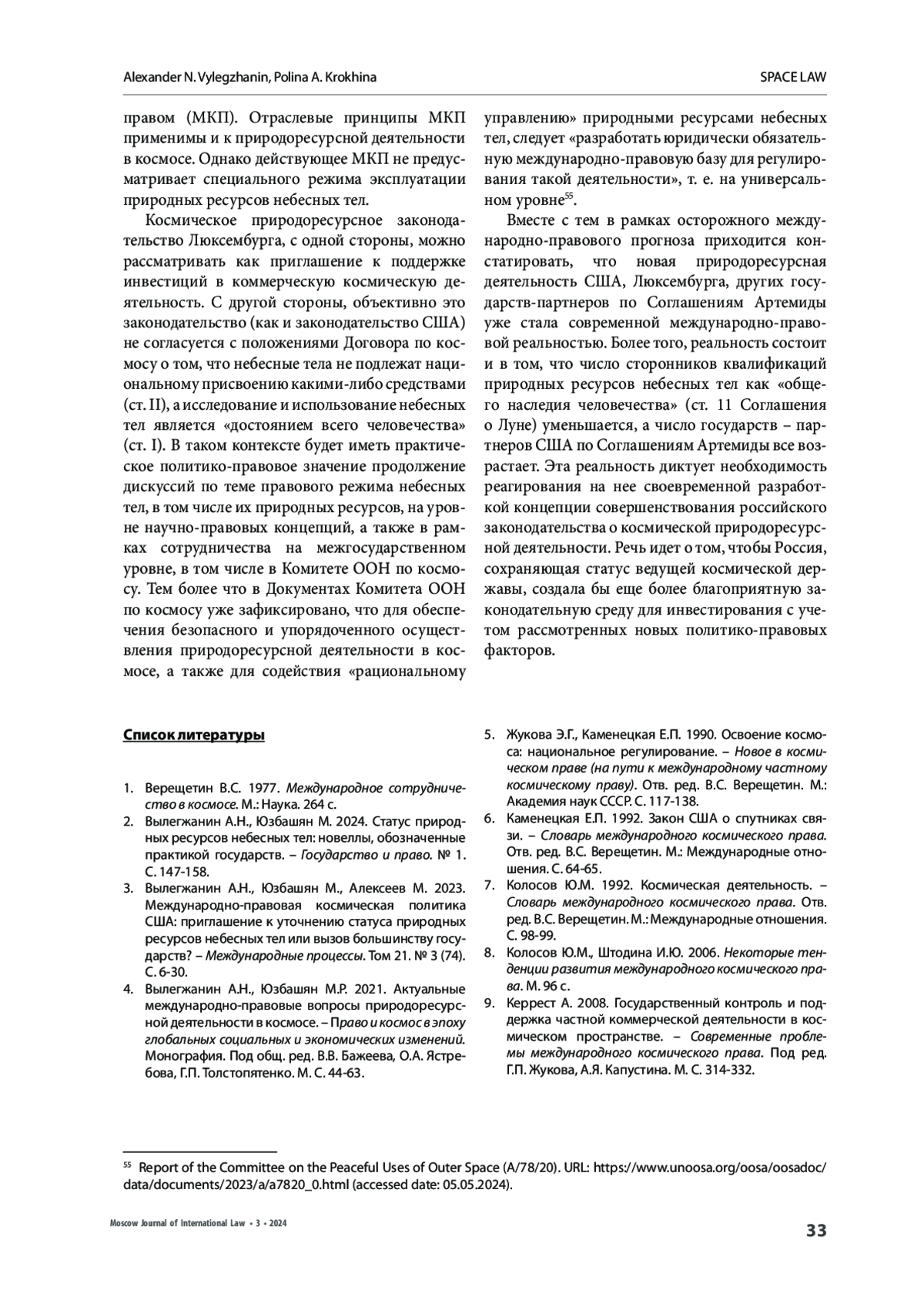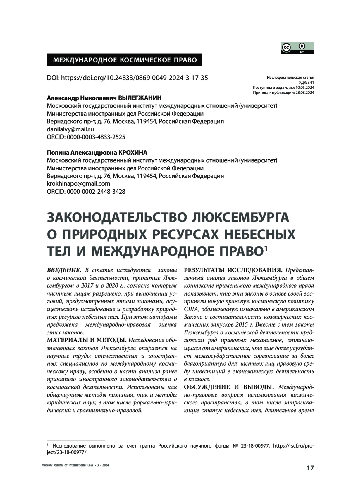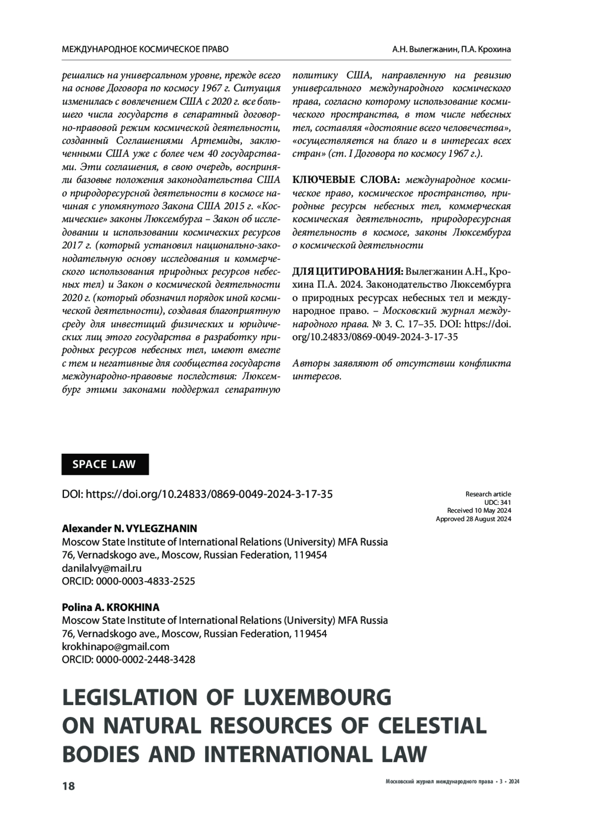 ВЫЛЕГЖАНИН А. Н., КРОХИНА П. А. ЗАКОНОДАТЕЛЬСТВО ЛЮКСЕМБУРГА О ПРИРОДНЫХ РЕСУРСАХ НЕБЕСНЫХ ТЕЛ И МЕЖДУНАРОДНОЕ ПРАВО // МОСКОВСКИЙ ЖУРНАЛ МЕЖДУНАРОДНОГО ПРАВА. 2024. ВЫПУСК 3