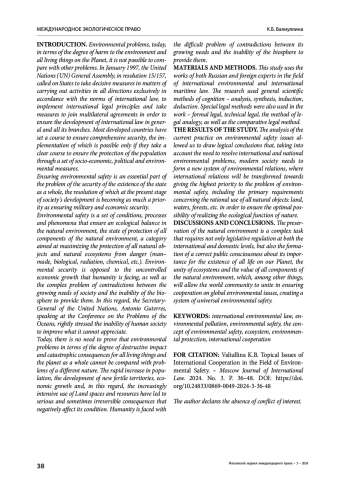 ВВЕДЕНИЕ. Проблемы экологического характера на сегодняшний день по степени причинения вреда окружающей природной среде и всему живому на планете невозможно сравнить с иными проблемами. В январе 1997 г. Генеральная Ассамблея Организации Объединенных Наций (ООН) в резолюции 15/157 призвала государства к принятию решительных мер в вопросах осуществления деятельность во всех направлениях исключительно в соответствии с нормами международного права, к реализации международно-правовых принципов и принятию мер по присоединению к многосторонним соглашениям в целях обеспечения развития международного права в целом и всех его отраслей. Большинство развитых государств взяли курс на обеспечение всеобъемлющей безопасности, которая возможна только в случае взятия четкого курса на охрану населения посредством комплекса мер социально-экономического, политического, а также природоохранного характера. Обеспечение экологической безопасности являет собой важнейшую часть проблемы безопасности существования государства в целом, разрешение которой на современном этапе развития общества становится таким же приоритетным направлением, как обеспечение военной и экономической безопасности. Экологическая безопасность есть совокупность состояний, процессов и явлений, обеспечивающих экологический баланс в окружающей природной среде, состояние защищенности всех компонентов природной среды, категория, направленная на то, чтобы максимально оградить все объекты природы и природные экосистемы от опасности (техногенной, биологической, радиационной, химической и пр.). Экологическая безопасность противостоит бесконтрольному экономическому росту, с которым столкнулось человечество, а также противоречиям между растущими потребностями общества и невозможностью биосферы их обеспечить. В связи с этим Генеральный секретарь ООН Антониу Гутерриш, выступая на Конференции по проблемам Мирового океана, справедливо подчеркнул неспособность общества улучшить то, значимость чего оно не может оценить. Сегодня, нет необходимости доказывать, что проблемы экологического характера по степени разрушительного воздействия и катастрофическим последствиям для всего живого и планеты в целом невозможно сравнить с проблемами иного характера. Стремительное увеличение численности населения, освоение новых плодородных территорий, экономический рост и все более интенсивное в связи с этим использование пространств и ресурсов Земли привели к серьезным и подчас необратимым последствиям, негативно влияющим на ее состояние.