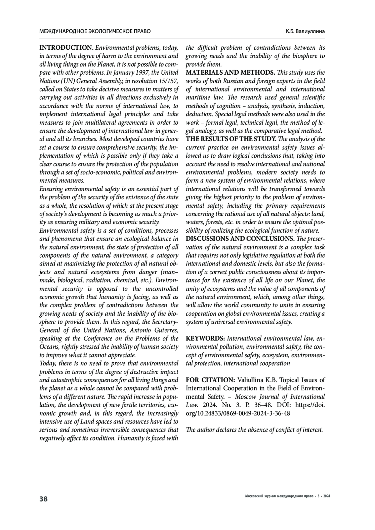 МАТЕРИАЛЫ И МЕТОДЫ. В настоящем исследовании использованы труды как российских, так и зарубежных специалистов в области международного экологического и международного морского права. В ходе исследования использовались общенаучные методы познания: анализ, синтез, индукция, дедукция. Также в работе использовались специальные юридические методы: формально-юридический, технико-юридический, метод юридической аналогии, а также сравнительно-правовой метод.