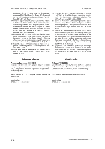 3. Васильев А., Печатнова Ю. 2020. Искусственный интеллект и право: проблемы, перспективы. - Российско-азиатский правовой журнал. № 2. С. 14-18.