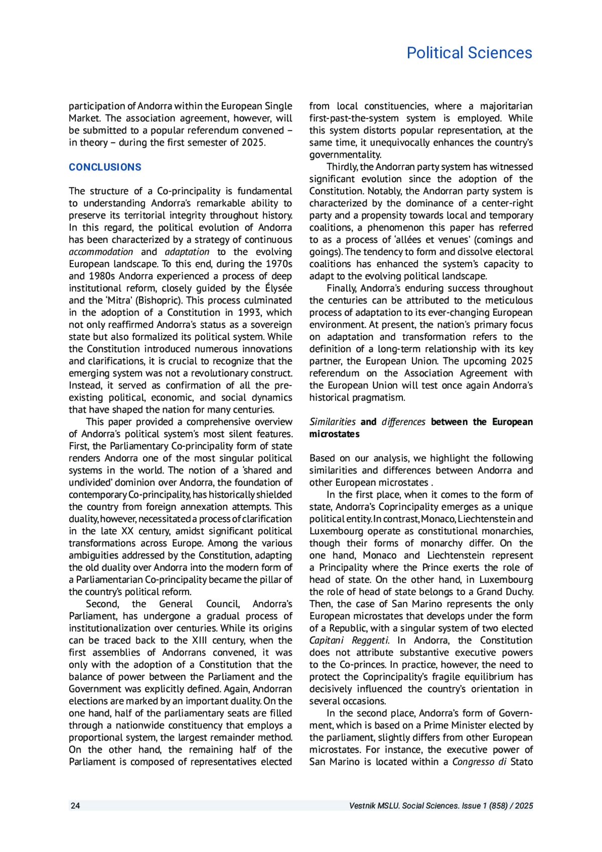 Политическая система Андорры, характеризующаяся парламентской моделью совместного управления княжествами и особой исторической траекторией, представляет собой уникальный пример европейского государственного устройства. Несмотря на свою уникальную институциональную структуру, андоррская модель мало освещена в политологической литературе. Данная статья направлена на устранение этого пробела путем проведения всестороннего анализа политической системы Андорры с акцентом на ее институциональные структуры, историческую эволюцию и современную динамику управления. С использованием историко-институционального подхода в исследовании рассматривается трансформация политической системы Андорры от ее средневековых образцов до принятия Конституции в 1993 году, которая официально закрепила ее статус суверенной парламентской демократии. В исследовании рассматривается роль ключевых институтов, включая Генеральный совет, избирательную систему и развитие политических партий. Параллельно рассматривается влияние внешних факторов, в частности, развитие отношений Андорры с Европейским союзом. С этой целью в документе используется подход сравнительной политологии, сравнивающий структуру управления Андорры с другими европейскими микрогосударствами, такими как Монако, Сан-Марино, Лихтенштейн и Люксембург. Этот методологический подход позволяет оценить институциональную адаптируемость Андорры, ее демократическую консолидацию и международное положение. Анализ правовой, политической и территориальной организации Андорры в данном исследовании способствует пониманию управления малыми государствами и динамики суверенитета в современной Европе. Результаты исследования подчеркивают институциональную устойчивость Андорры и ее способность сочетать историческую преемственность с современными политическими преобразованиями, предлагая ценную информацию ученым в области сравнительной политологии, конституционного права и европейской интеграции.