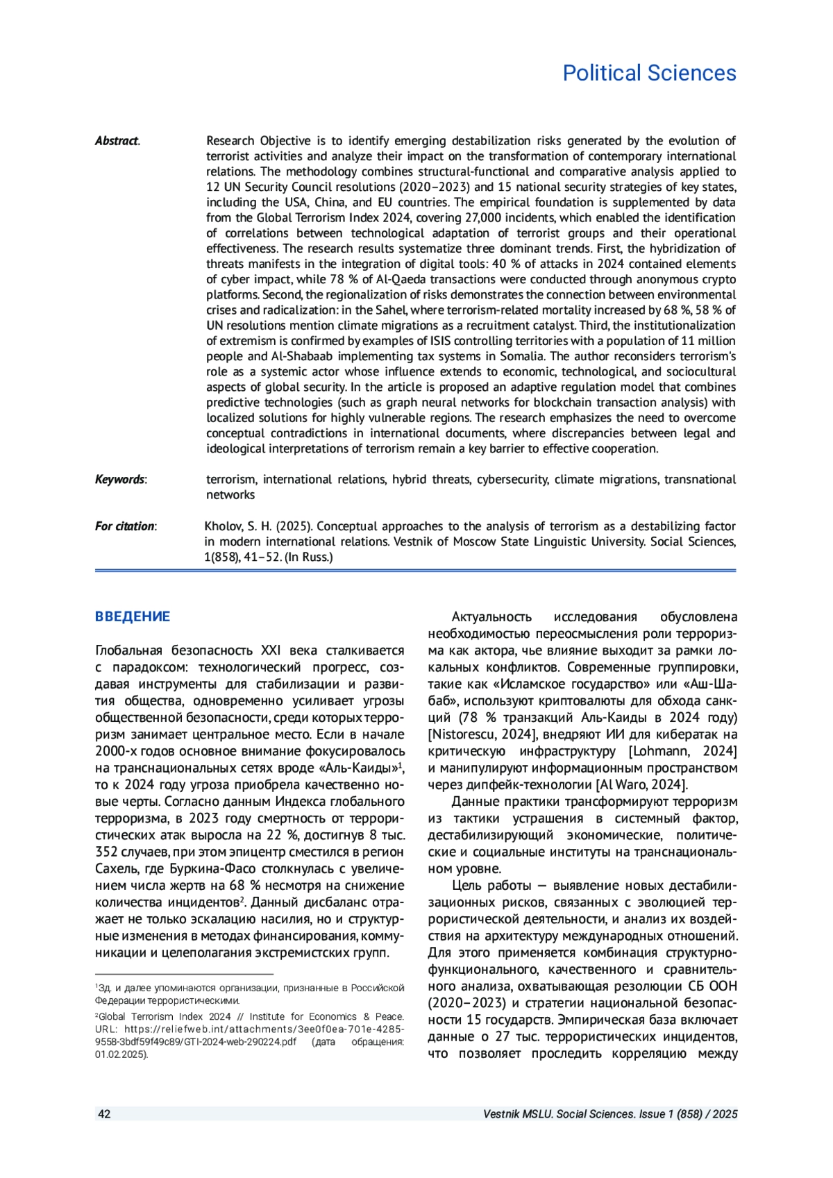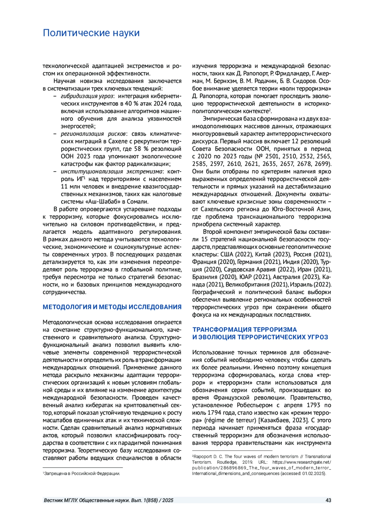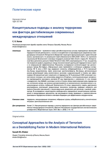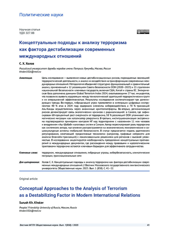 Цель исследования - выявление новых дестабилизационных рисков, порождаемых эволюцией террористической деятельности, и анализ их воздействия на трансформацию современных международных отношений. Методология объединяет структурно-функциональный и сравнительный анализ, примененный к 12 резолюциям Совета Безопасности ООН (2020-2023) и 15 стратегиям национальной безопасности ключевых государств, включая США, Китай и страны ЕС. Эмпирическая база дополнена данными Global Terrorism Index 2024, охватывающими 27 тыс. инцидентов, что позволило выявить корреляции между технологической адаптацией террористических групп и их операционной эффективностью. Результаты исследования систематизируют три доминирующих тренда. Во-первых, гибридизация угроз проявляется в интеграции цифровых инструментов: 40 % атак в 2024 году содержали элементы кибервоздействия, а 78 % транзакций Аль-Каиды осуществлялись через анонимные криптоплатформы. Во-вторых, регионализация рисков демонстрирует связь экологических кризисов с радикализацией: в Сахеле, где зафиксирован 68-процентный рост смертности от терроризма, 58 % резолюций ООН упоминают климатические миграции как катализатор рекрутинга. В-третьих, институционализация экстремизма подтверждается примерами контроля ИГ над территориями с населением 11 млн человек и внедрением «Аш-Шабаб» налоговых систем в Сомали. Автор пересматривает роль терроризма как системного актора, чье влияние распространяется на экономические, технологические и социокультурные аспекты глобальной безопасности. В статье предлагается модель адаптивного регулирования, сочетающей предиктивные технологии (например, графовые нейросети для анализа блокчейн-транзакций) с локализованными решениями для регионов с высокой уязвимостью. В исследовании акцентируется необходимость преодоления концептуальных противоречий в международных документах, где расхождения между правовыми и идеологическими трактовками терроризма остаются ключевым барьером для эффективного сотрудничества.