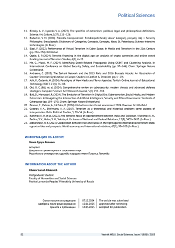 4. Казакбаев И. З. Мировой терроризм и экстремизм глобальная проблема современной системы международных отношений // Вестник Международного Университета Кыргызстана. 2023. Т. 2. № 50. С. 93-97. EDN: BWDDWJ
