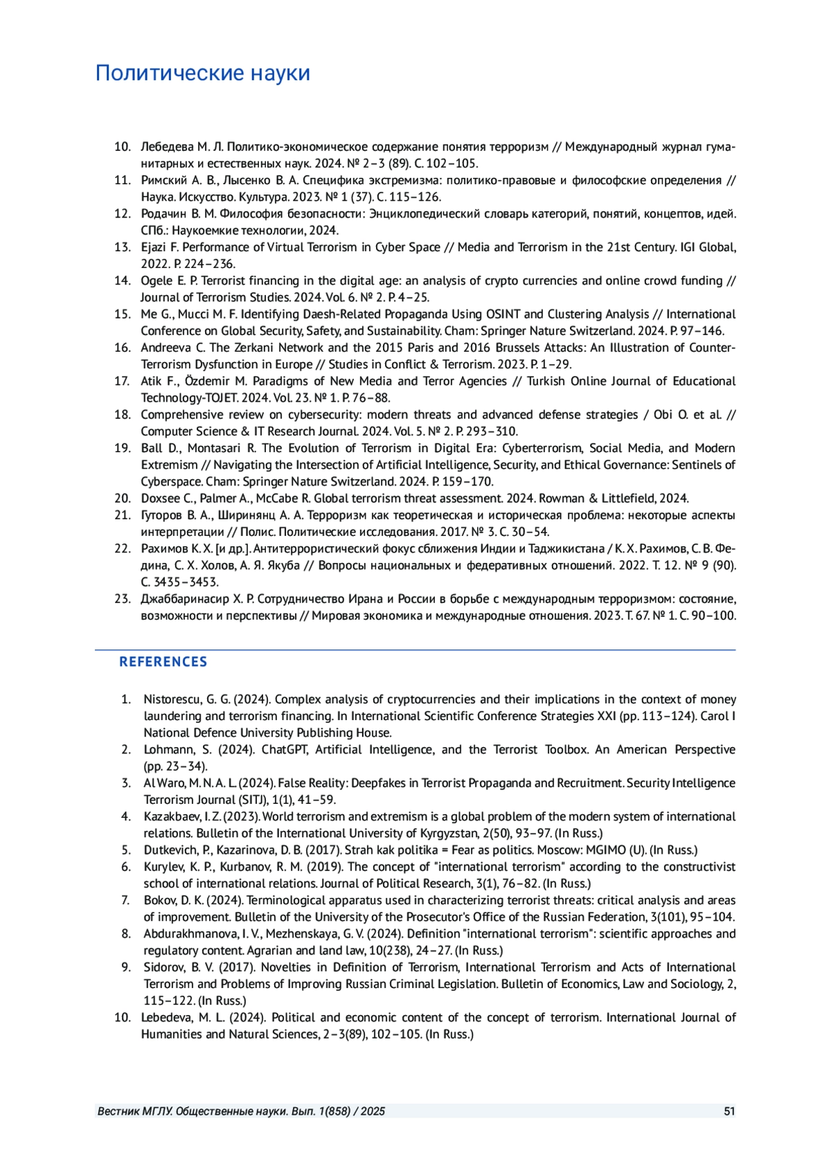 10. Лебедева М. Л. Политико-экономическое содержание понятия терроризм // Международный журнал гуманитарных и естественных наук. 2024. № 2-3 (89). С. 102-105. EDN: WZFKFA