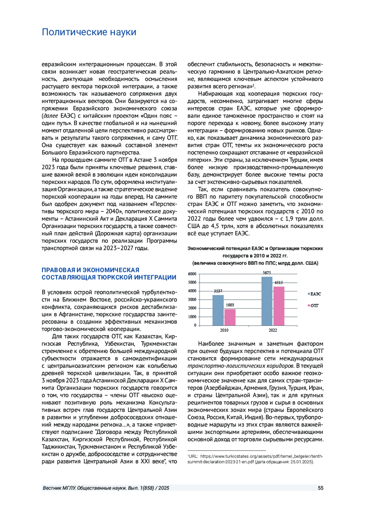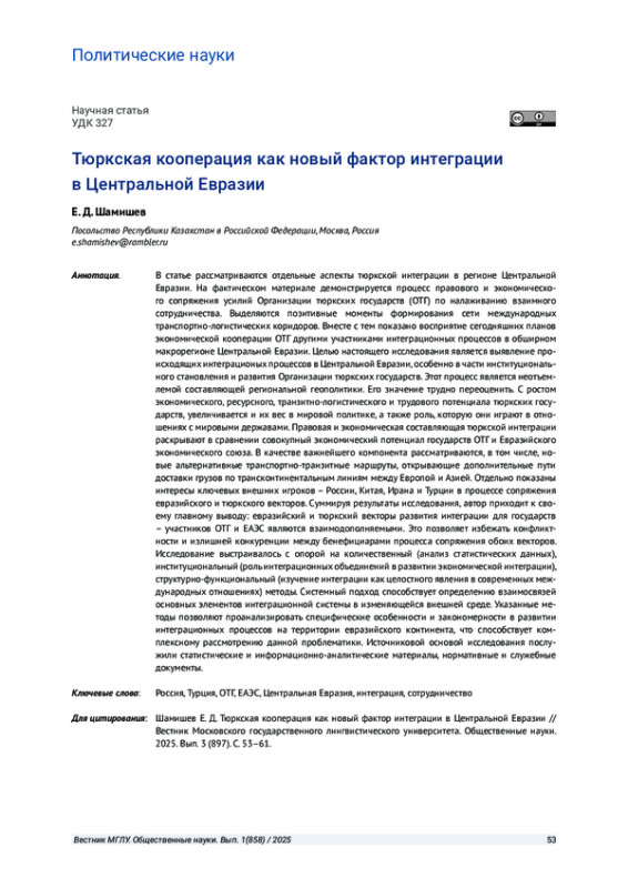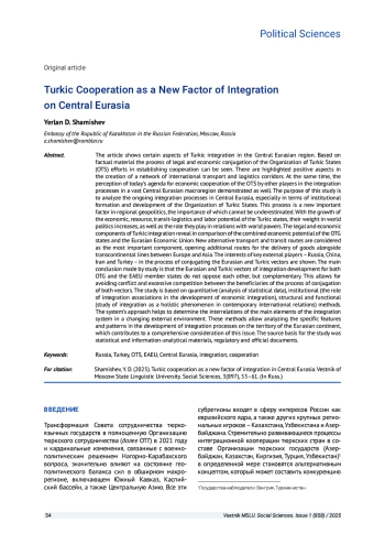 В статье рассматриваются отдельные аспекты тюркской интеграции в регионе Центральной Евразии. На фактическом материале демонстрируется процесс правового и экономического сопряжения усилий Организации тюркских государств (ОТГ) по налаживанию взаимного сотрудничества. Выделяются позитивные моменты формирования сети международных транспортно-логистических коридоров. Вместе с тем показано восприятие сегодняшних планов экономической кооперации ОТГ другими участниками интеграционных процессов в обширном макрорегионе Центральной Евразии. Целью настоящего исследования является выявление происходящих интеграционных процессов в Центральной Евразии, особенно в части институционального становления и развития Организации тюркских государств. Этот процесс является неотъемлемой составляющей региональной геополитики. Его значение трудно переоценить. С ростом экономического, ресурсного, транзитно-логистического и трудового потенциала тюркских государств, увеличивается и их вес в мировой политике, а также роль, которую они играют в отношениях с мировыми державами. Правовая и экономическая составляющая тюркской интеграции раскрывают в сравнении совокупный экономический потенциал государств ОТГ и Евразийского экономического союза. В качестве важнейшего компонента рассматриваются, в том числе, новые альтернативные транспортно-транзитные маршруты, открывающие дополнительные пути доставки грузов по трансконтинентальным линиям между Европой и Азией. Отдельно показаны интересы ключевых внешних игроков - России, Китая, Ирана и Турции в процессе сопряжения евразийского и тюркского векторов. Суммируя результаты исследования, автор приходит к своему главному выводу: евразийский и тюркский векторы развития интеграции для государств - участников ОТГ и ЕАЭС являются взаимодополняемыми. Это позволяет избежать конфликтности и излишней конкуренции между бенефициарами процесса сопряжения обоих векторов. Исследование выстраивалось с опорой на количественный (анализ статистических данных), институциональный (роль интеграционных объединений в развитии экономической интеграции), структурно-функциональный (изучение интеграции как целостного явления в современных международных отношениях) методы. Системный подход способствует определению взаимосвязей основных элементов интеграционной системы в изменяющейся внешней среде. Указанные методы позволяют проанализировать специфические особенности и закономерности в развитии интеграционных процессов на территории евразийского континента, что способствует комплексному рассмотрению данной проблематики. Источниковой основой исследования послужили статистические и информационно-аналитические материалы, нормативные и служебные документы.