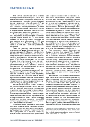 3. Чжан Юйянь. Организация тюркских государств (ОТГ): происхождение, мотивы, особенности и влияние // Вестник Пермского университета. Политология. 2023. Т. 17. № 1. C. 78-87. EDN: IBMKWJ