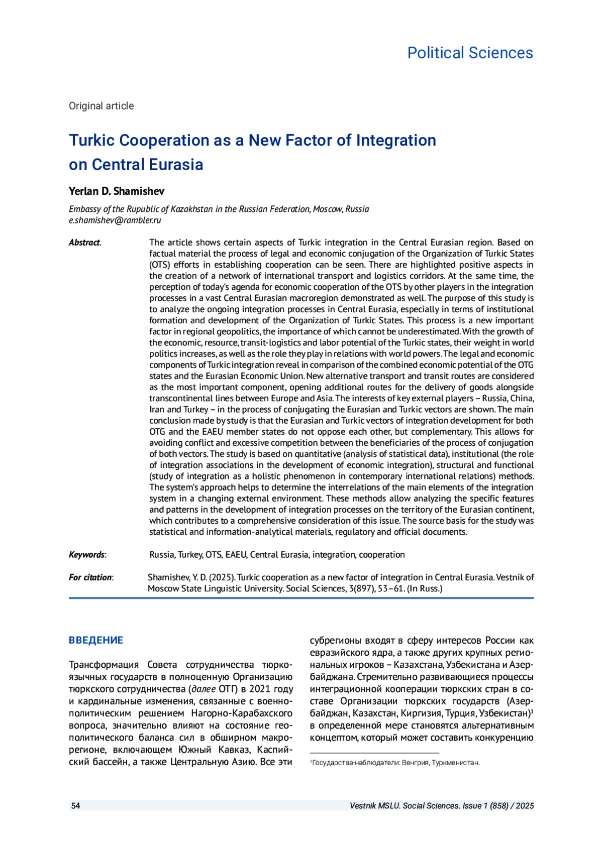 Трансформация Совета сотрудничества тюркоязычных государств в полноценную Организацию тюркского сотрудничества (далее ОТГ) в 2021 году и кардинальные изменения, связанные c военно- политическим решением Нагорно-Карабахского вопроса, значительно влияют на состояние геополитического баланса сил в обширном макрорегионе, включающем Южный Кавказ, Каспийский бассейн, а также Центральную Азию.
