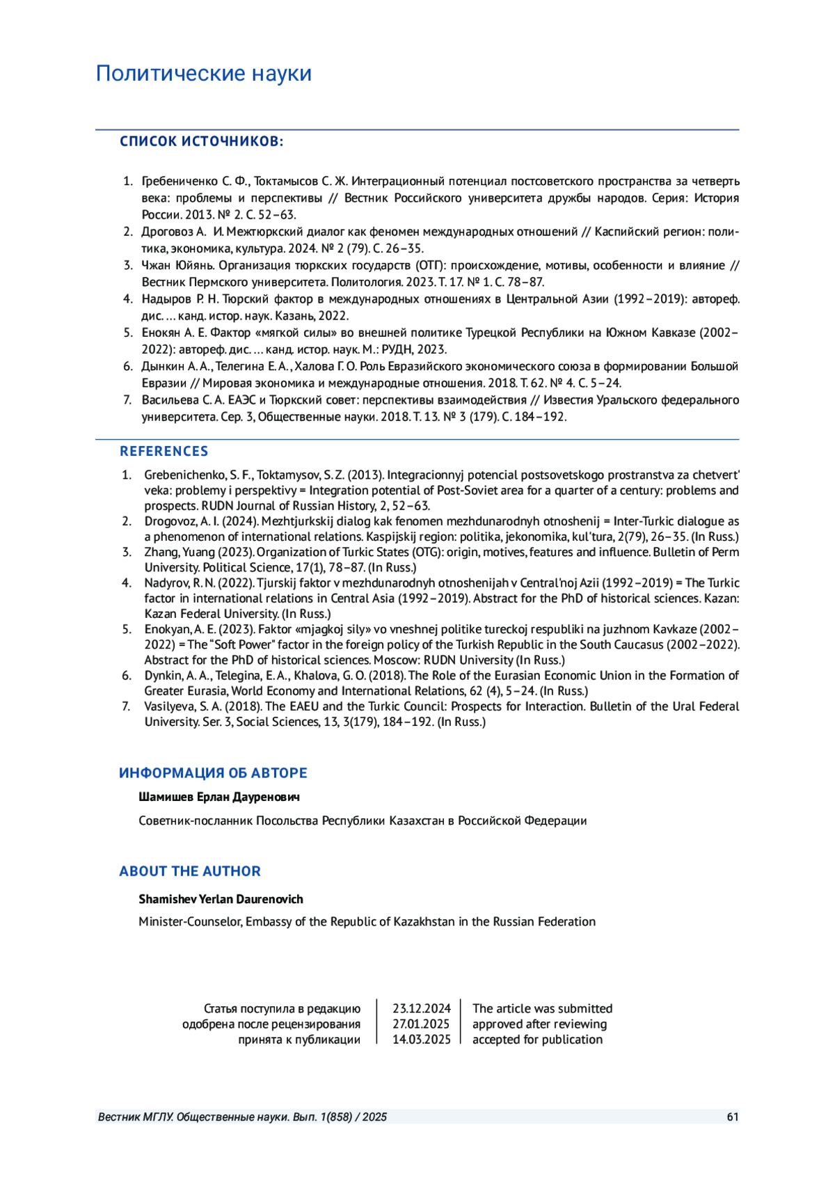 4. Надыров Р. Н. Тюрский фактор в международных отношениях в Центральной Азии (1992-2019): автореф. дис.. канд. истор. наук. Казань, 2022. EDN: UTGZIO