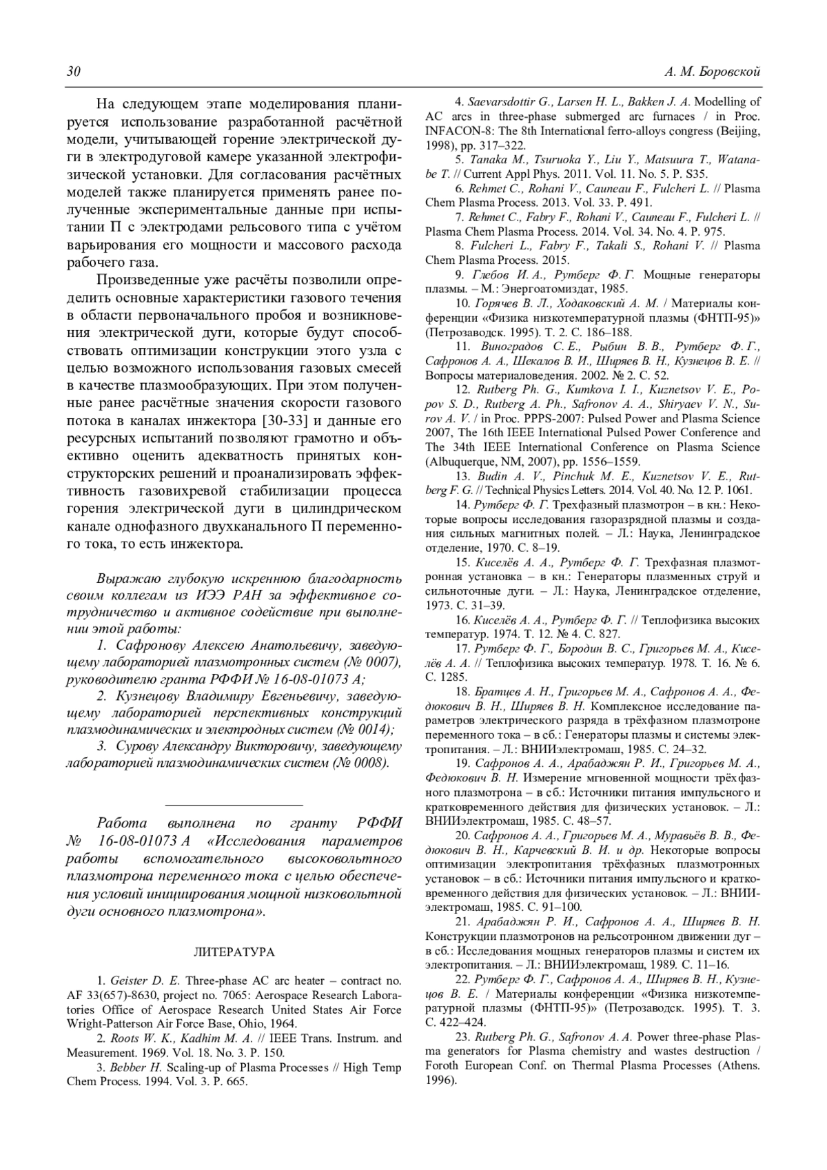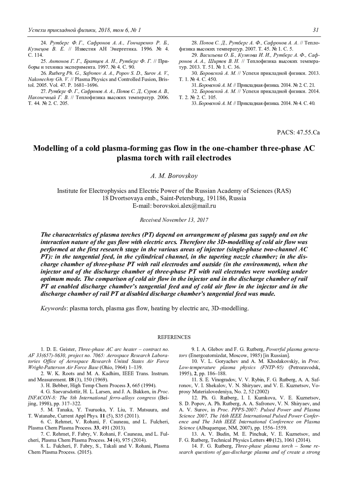 БОРОВСКОЙ А. М. МОДЕЛИРОВАНИЕ ТЕЧЕНИЯ ХОЛОДНОГО ПЛАЗМООБРАЗУЮЩЕГО ГАЗА В ОДНОКАМЕРНОМ ТРЁХФАЗНОМ ПЛАЗМОТРОНЕ ПЕРЕМЕННОГО ТОКА С ЭЛЕКТРОДАМИ РЕЛЬСОВОГО ТИПА // УСПЕХИ ПРИКЛАДНОЙ ФИЗИКИ. 2018. ТОМ 6, №1