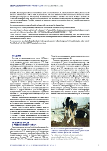Заключение. Средний уровень заболеваемости ротавирусной инфекцией в мире составляет 32,7%, коронавирусной инфекцией – 18,4%, колибактериозом – 39,1%. В России показатель превалентности вышеупомянутых болезней равен 41,4; 33,1 и 30,2% соответственно. Таким образом, в Российской Федерации уровень заболеваемости рота- и коронавирусной инфекциями крупного рогатого скота превышает средний показатель в мире на 8,7 и 14,7% соответственно. Эпизоотическая ситуация по колибактериозу в России благополучнее, чем в большинстве стран: болезнь регистрируется реже среднего мирового значения на 8,9%. Большое генетическое разнообразие и распространенность вышеупомянутых возбудителей требуют комплексного подхода для борьбы с ними. Одним из наиболее эффективных способов является вакцинопрофилактика, что делает разработку эффективных и безопасных вакцинных препаратов против ротавирусной, коронавирусной инфекций и эшерихиоза актуальной задачей.