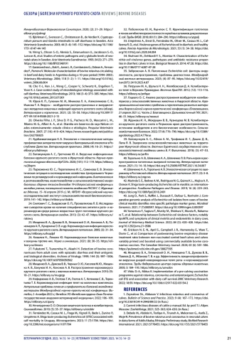 38. Жданова И. Н., Мокрушин В. В., Кузнецова М. В. Колибактериоз крупного рогатого скота в Пермском крае: распространенность, источники возбудителя и его биологические особенности. Сельскохозяйственная биология. 2022; 57 (4): 776-790. DOI: 10.15389/agrobiology.2022.4.776rus