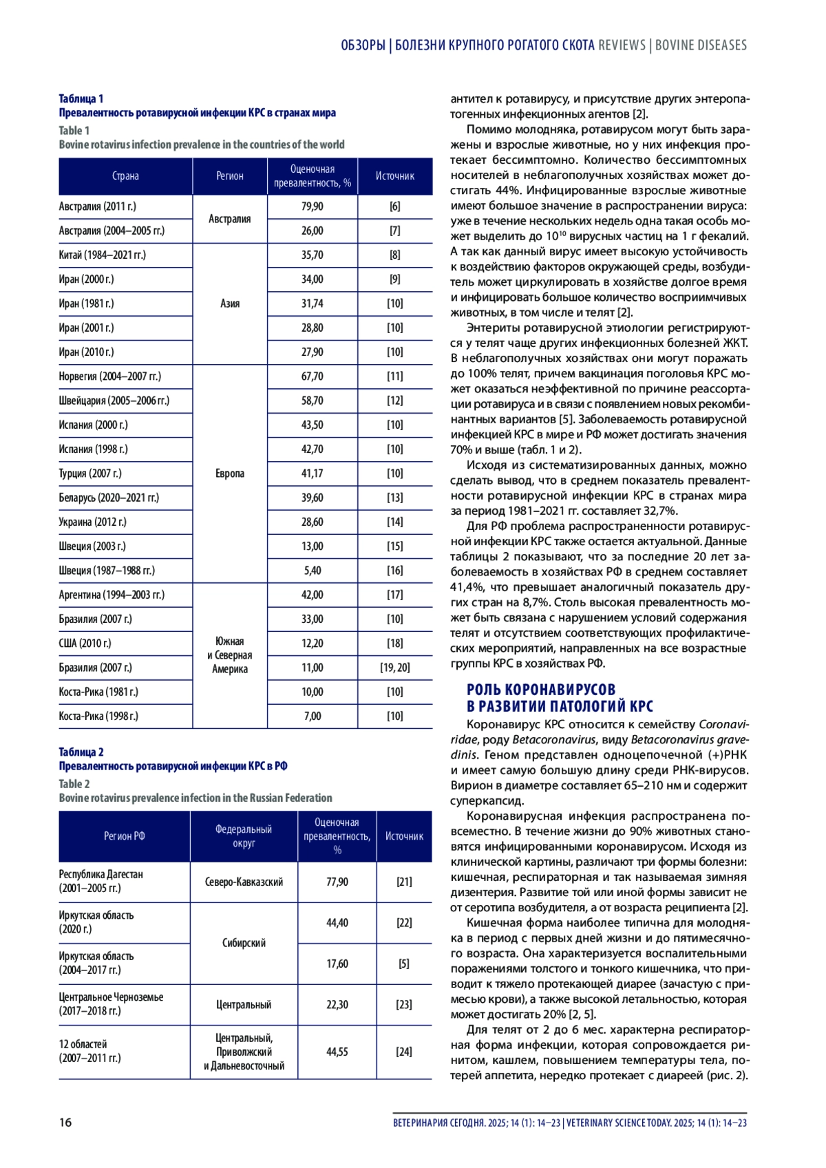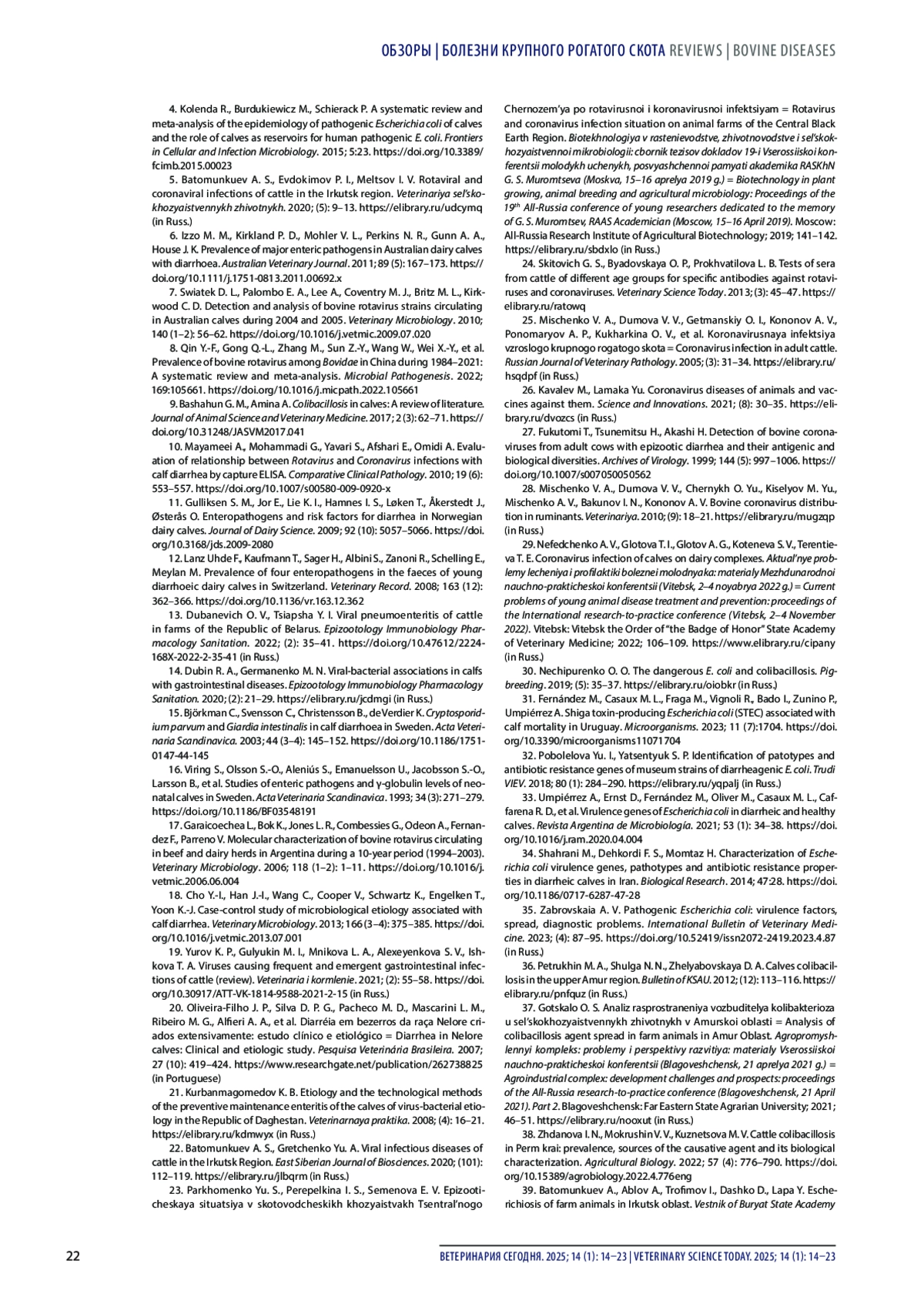 24. Скитович Г. С., Бьядовская О. П., Прохватилова Л. Б. Исследование сывороток крови на наличие специфических антител к рота- и коронавирусам среди разных возрастных групп поголовья крупного рогатого скота. Ветеринария сегодня. 2013; (3): 42-47.