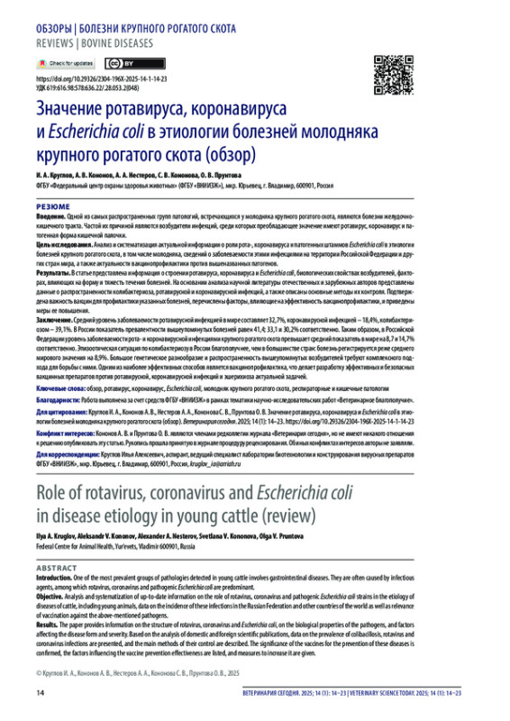 Цель исследования. Анализ и систематизация актуальной информации о роли рота-, коронавируса и патогенных штаммов Escherichia coli в этиологии болезней крупного рогатого скота, в том числе молодняка, сведений о заболеваемости этими инфекциями на территории Российской Федерации и других стран мира, а также актуальности вакцинопрофилактики против вышеназванных патогенов.