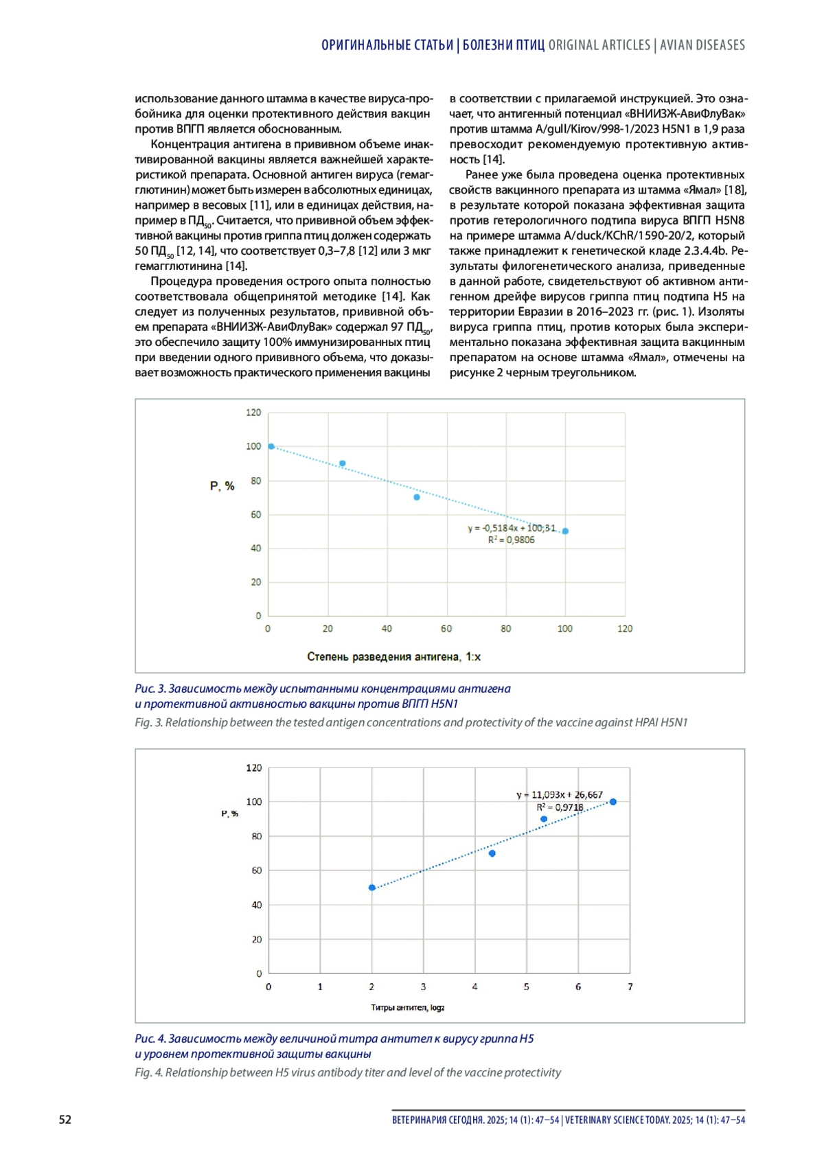Цель исследования. Оценка иммуногенной активности инактивированной вакцины «ВНИИЗЖ-АвиФлуВак» против актуального для России в 2023 г. высокопатогенного вируса гриппа птиц подтипа H5N1. Материалы и методы. Для испытаний готовили 4 вакцинных образца, содержащих цельный и разведенный 1/25, 1/50 и 1/100 антиген вируса гриппа птиц Н5 в прививном объеме. Каждым препаратом была привита отдельная группа птиц 4-недельного возраста. Через 28 сут куры были заражены вирусом гриппа птиц A/gull/Kirov/998-1/2023 H5N1, который был выделен во время вспышки заболевания на территории Российской Федерации и филогенетически определен как высокопатогенный возбудитель, принадлежащий к азиатской генетической линии вируса высокопатогенного гриппа птиц подтипа H5 (клада 2.3.4.4b). В группах зараженных птиц в течение 6 дней регистрировали погибших и больных особей.