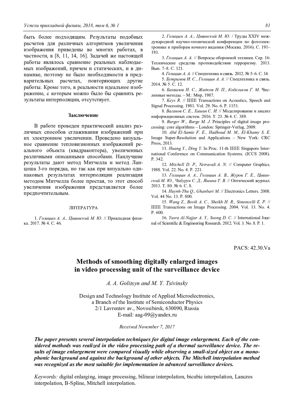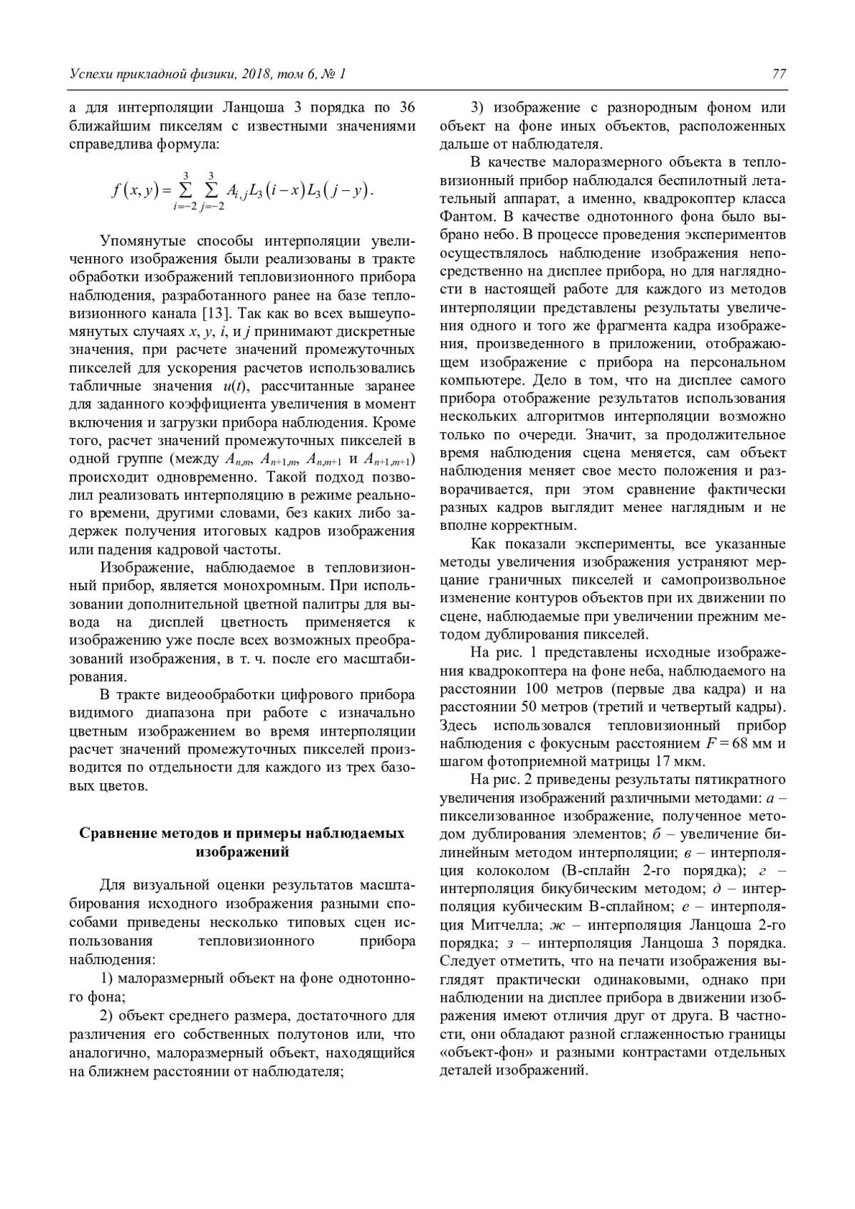 В работе проведен практический анализ различных способов сглаживания изображений при их электронном увеличении. Проведено визуальное сравнение тепловизионных изображений реального объекта (квадракоптера), увеличенных различными описанными способами. Наилучшие результаты дают метод Митчелла и метод Ланцоша 3-го порядка, но так как при визуально одинаковых результатах интерполяции реализация методом Митчелла более простая, то этот способ увеличения изображения представляется более предпочтительным.