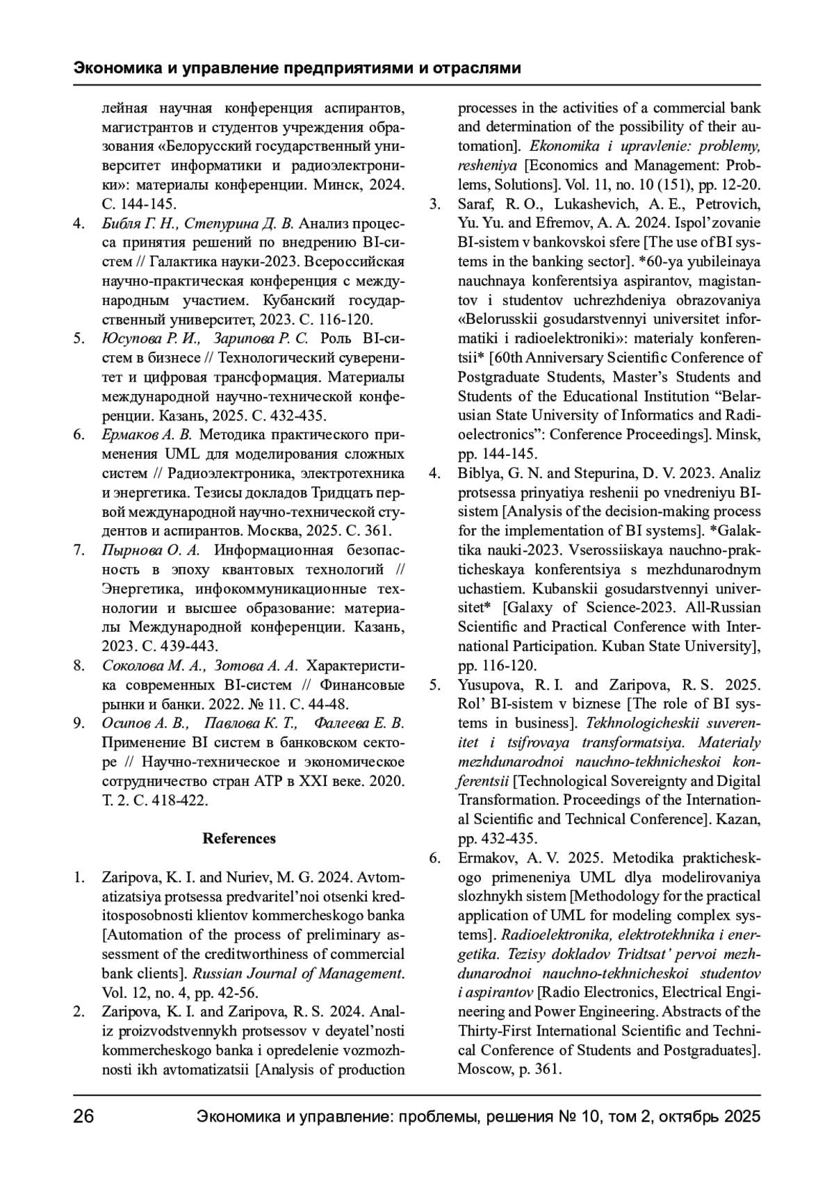 2. Зарипова К. И., Зарипова Р. С. Анализ производственных процессов в деятельности коммерческого банка и определение возможности их автоматизации // Экономика и управление: проблемы, решения. 2024. Т. 11, № 10(151). С. 12-20. EDN: QFSZLE