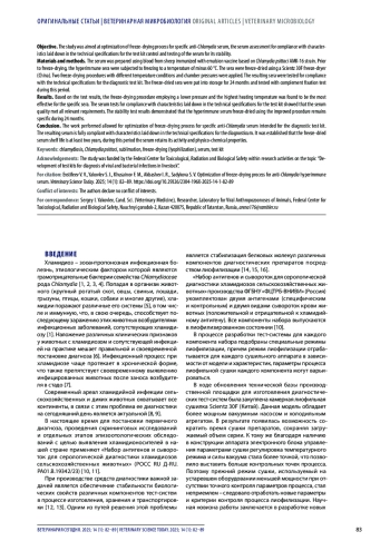 Введение. Современный ареал хламидийной инфекции сельскохозяйственных и диких животных охватывает почти все континенты. В настоящее время для постановки первичного диагноза, проведения скрининговых исследований и отдельных этапов эпизоотологических обследований с целью выявления хламидионосителей в нашей стране применяют «Набор антигенов и сывороток для серологической диагностики хламидиозов сельскохозяйственных животных». При производстве средств диагностики важной задачей является обеспечение стабильности различных компонентов тест-систем в процессе их хранения и транспортировки. Одним из путей решения этой проблемы является стабилизация различных компонентов диагностических препаратов посредством лиофилизации.