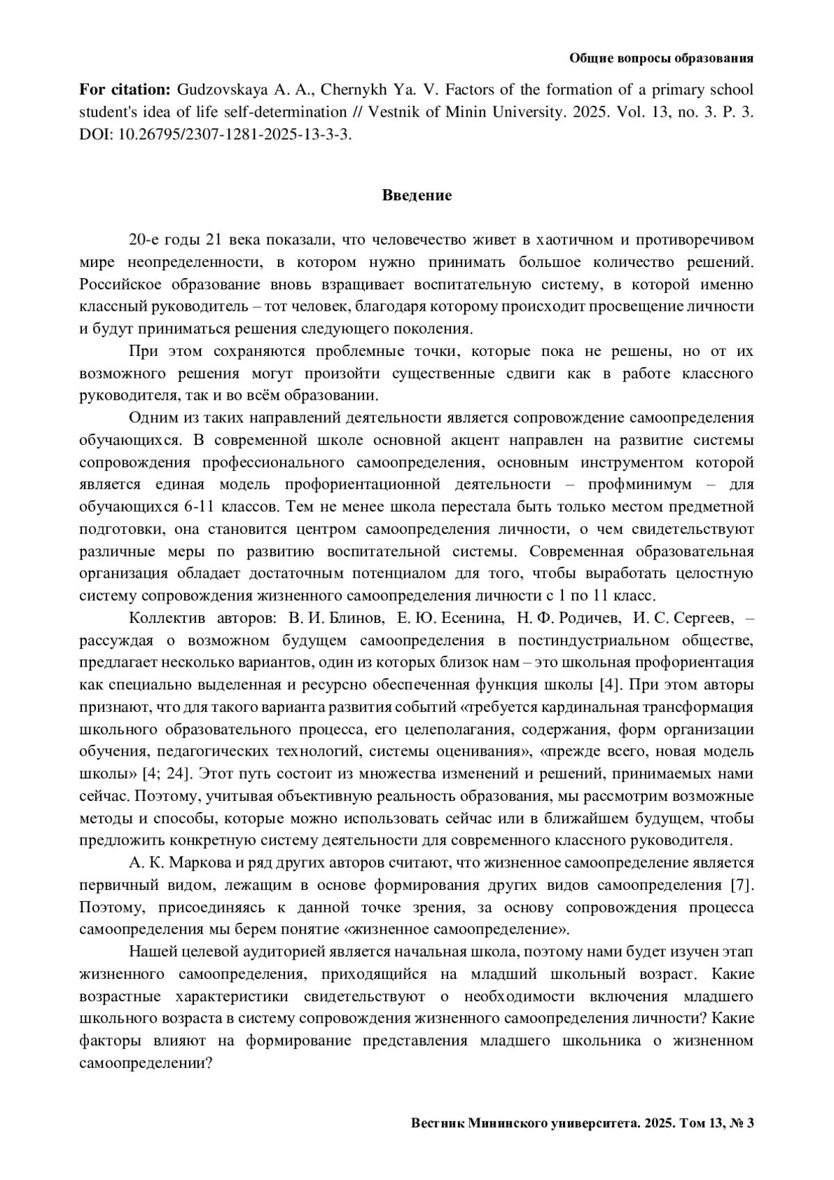 Введение. В статье раскрывается сущность понятия «представление младшего школьника о жизненном самоопределении», обозначены факторы формирования данного представления. Авторы предлагают обновленный перечень факторов, которые влияют на представление младшего школьника о жизненном самоопределении и должны быть учтены в планировании деятельности классного руководителя.