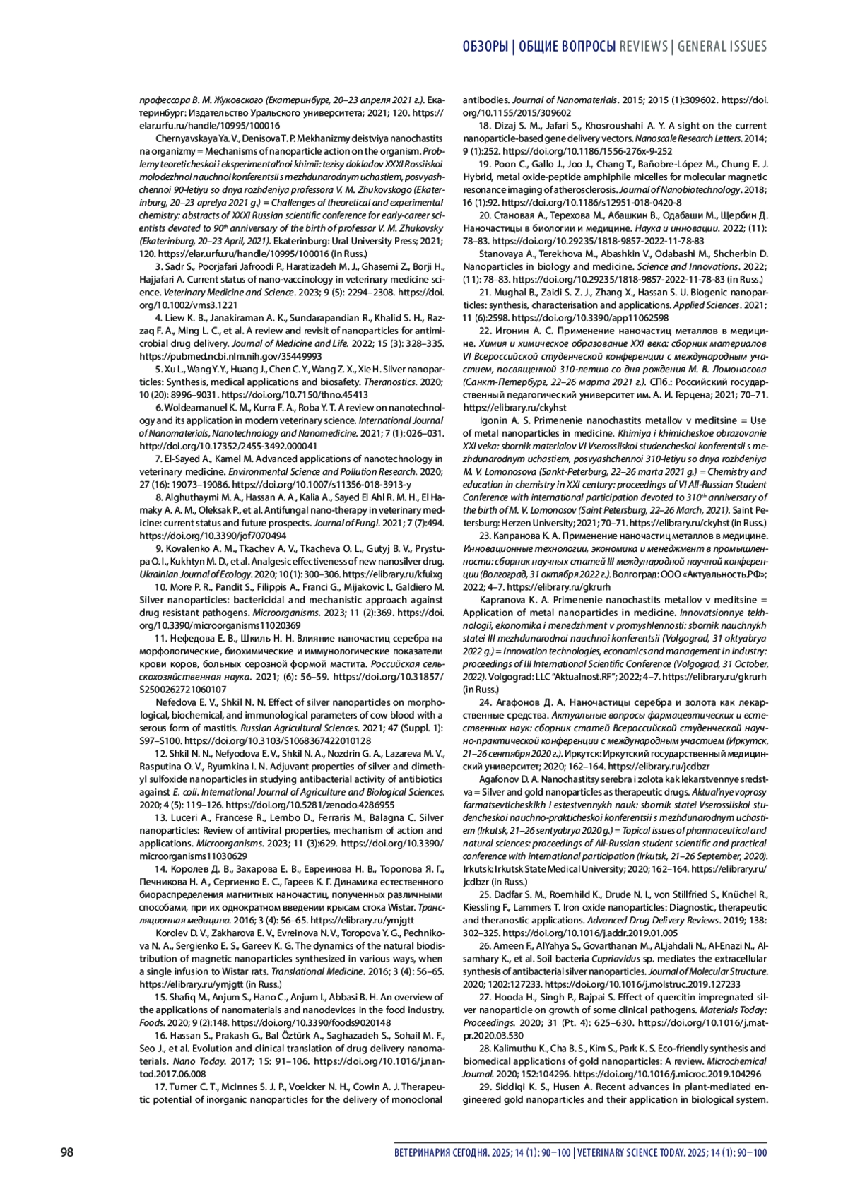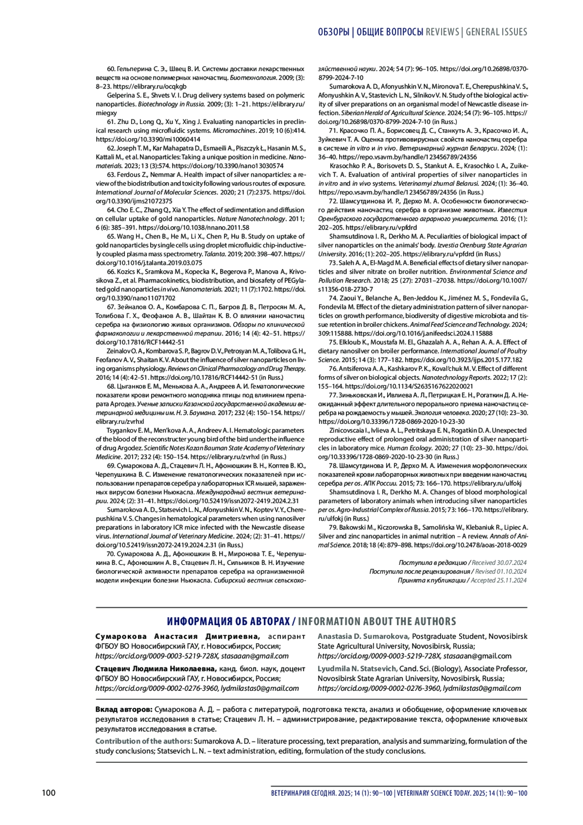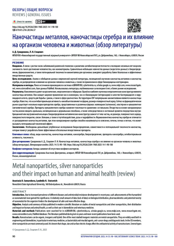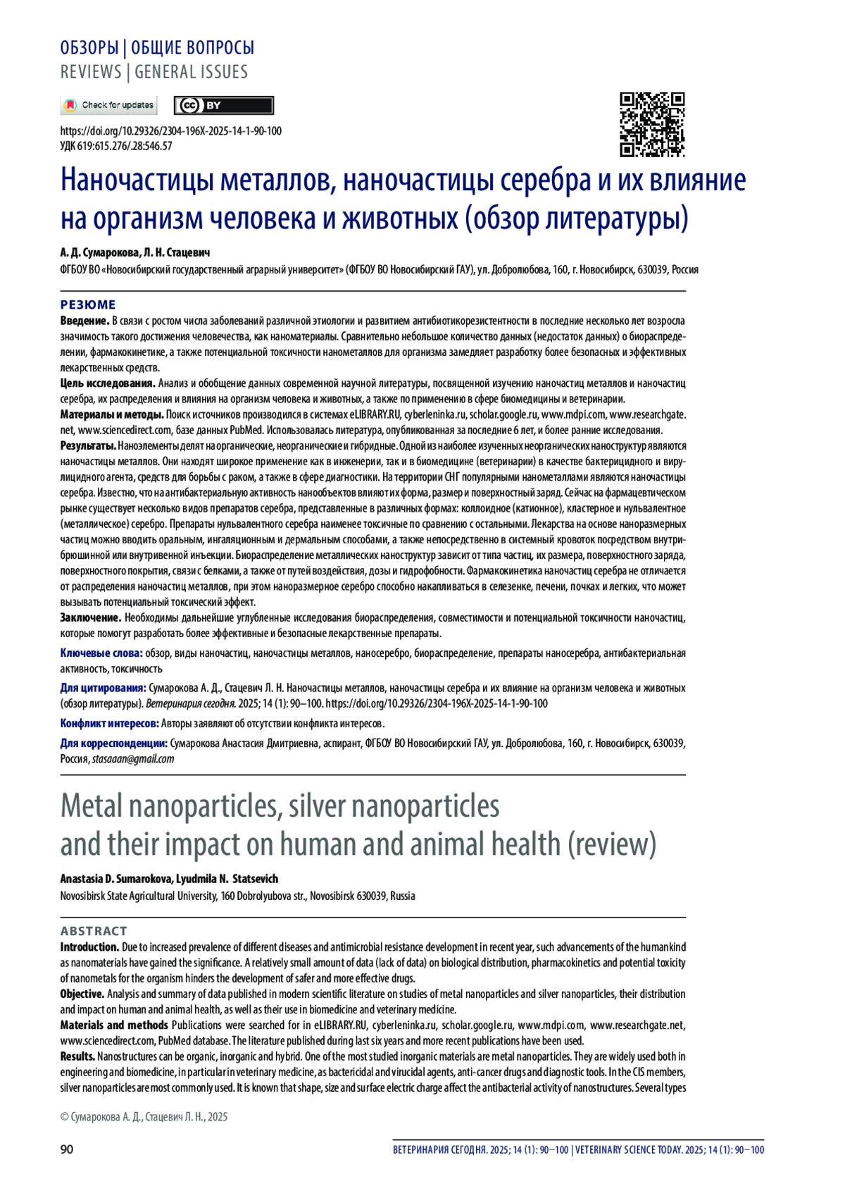 СУМАРОКОВА А. Д., СТАЦЕВИЧ Л. Н. НАНОЧАСТИЦЫ МЕТАЛЛОВ, НАНОЧАСТИЦЫ СЕРЕБРА И ИХ ВЛИЯНИЕ НА ОРГАНИЗМ ЧЕЛОВЕКА И ЖИВОТНЫХ (ОБЗОР ЛИТЕРАТУРЫ) // ВЕТЕРИНАРИЯ СЕГОДНЯ. 2025. № 1, ТОМ 14