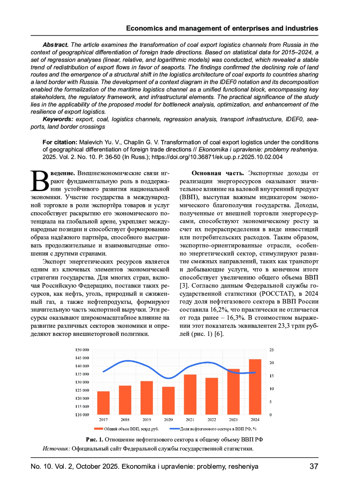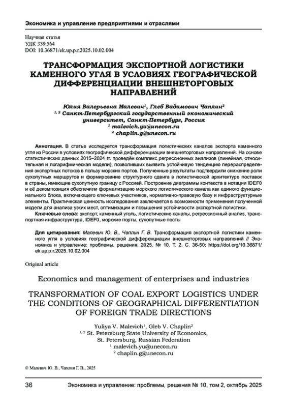 В статье исследуется трансформация логистических каналов экспорта каменного угля из России в условиях географической дифференциации внешнеторговых направлений. На основе статистических данных 2015-2024 гг. проведён комплекс регрессионных анализов (линейная, относительная и логарифмическая модели), позволивших выявить устойчивую тенденцию перераспределения экспортных потоков в пользу морских портов. Полученные результаты подтвердили снижение роли сухопутных маршрутов и формирование структурного сдвига в логистической архитектуре поставок в страны, имеющие сухопутную границу с Россией. Построение диаграммы контекста в нотации IDEF0 и её декомпозиция обеспечили формализацию морского логистического канала как единого функционального блока, включающего ключевых участников, нормативно-правовую базу и инфраструктурные элементы. Практическая ценность исследования заключается в возможности применения полученной модели для анализа узких мест, оптимизации и повышения устойчивости экспортной логистики.