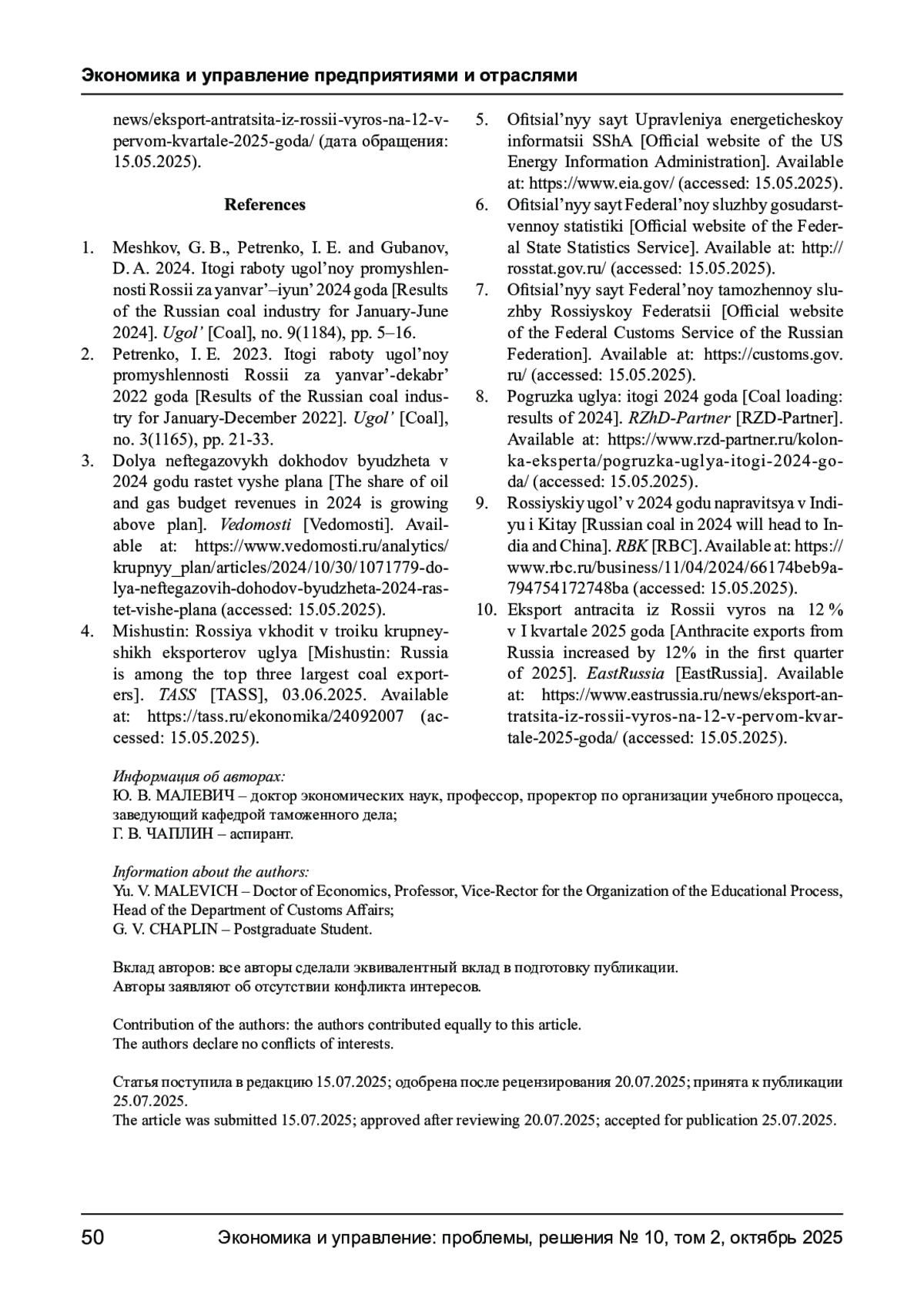 10. Экспорт антрацита из России вырос на 12 % в I квартале 2025 года // EastRussia [Электронный ресурс]. URL: https://www.eastrussia.ru/news/eksport-antratsita-iz-rossii-vyros-na-12-vpervom-kvartale-2025-goda/(дата обращения: 15.05.2025).