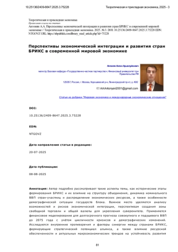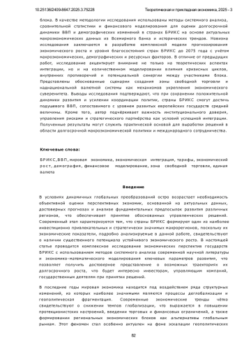 Автор подробно рассматривает такие аспекты темы, как исторические этапы формирования Б Р И К С и их влияние на структуру объединения, динамика номинального В В П стран-участниц и распределение экономических ресурсов, а также особенности демографической ситуации государств блока. Важное место уделяется анализу возможностей и рисков экономической интеграции, перспективам создания зоны свободной торговли и общей валюты для укрепления суверенитета. Применяется финансовое моделирование для долгосрочного прогноза совокупного и подушевого В В П до 2075 года с учётом цикличности кризисов и демографических изменений. Исследуются внутренние противоречия и факторы синергии между странами Б Р И К С, формирующие стратегический потенциал альянса, а также влияние ресурсной обеспеченности и актуальных макроэкономических трендов на устойчивость развития блока. В качестве методологии исследования использованы методы системного анализа, сравнительной статистики и финансового моделирования для оценки долгосрочной динамики В В П и демографических изменений в странах Б Р И К С на основе актуальных макроэкономических данных из Всемирного банка и исторических трендов. Новизна исследования заключается в разработке комплексной модели прогнозирования экономического роста и уровня благосостояния стран Б Р И К С до 2075 года с учётом макроэкономических, демографических и ресурсных факторов. В отличие от предыдущих работ, исследование акцентирует внимание не только на теоретических аспектах интеграции, но и на количественном моделировании влияния кризисных циклов, внутренних противоречий и потенциальной синергии между участниками блока. Представлены обоснованные сценарии создания зоны свободной торговли и наднациональной валютной системы как механизмов укрепления экономического суверенитета. Выводы исследования подтверждают, что при сохранении положительной динамики развития и усилении координации политик, страны Б Р И К С смогут достичь подушевого В В П, сопоставимого с уровнем развитых европейских государств средней величины. Кроме того, автор подчёркивает важность институционального доверия, управления рисками и стратегического партнёрства как условий успешной интеграции. Полученные результаты могут служить практической основой для выработки решений в области долгосрочной макроэкономической политики и международного сотрудничества