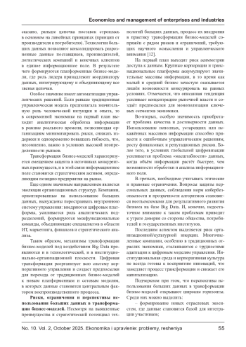 Статья посвящена анализу трансформации бизнес-моделей под воздействием технологий больших данных в современной экономике. Рассматриваются теоретико-методологические основы применения больших данных, их влияние на стратегическое управление предприятиями и институциональные ограничения цифровой модернизации. Особое внимание уделено вопросам адаптации традиционных моделей бизнеса к новым технологическим условиям и выявлению рисков цифровизации. В табличном виде обобщены количественные показатели, иллюстрирующие влияние внедрения технологий больших данных на трансформацию бизнес-моделей российских компаний. Внедрение технологий больших данных характеризует положительный эффект ключевых параметров бизнес-моделей российских компаний: ускорение процессов, рост доходности и увеличение доли новых продуктов в выручке. На основании анализа отечественных исследований выявлены ключевые направления изменений, включая повышение гибкости бизнес-процессов, интеграцию аналитических инструментов и усиление клиентоориентированности.