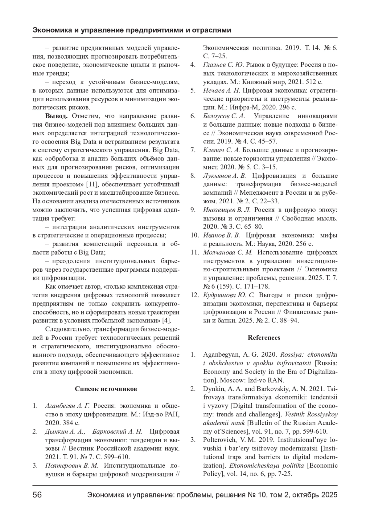 6. Белоусов С. А. Управление инновациями и большие данные: новые подходы в бизнесе // Экономическая наука современной России. 2019. № 4. С. 45-57.
