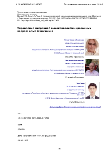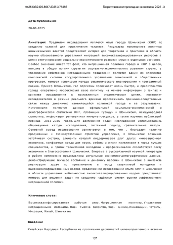 Предметом исследования является опыт города Шэньчжэня (К Н Р ) по созданию условий для привлечения талантов. Результаты мониторинга политики шэньчжэньских властей представляют интерес для теоретиков и практиков в области научно обоснованного управления миграцией высококвалифицированных ресурсов в целях стимулирования социально-экономического развития стран и отдельных регионов. Особое значение имеет тот факт, что миграционная политика города и К Н Р в целом, вписана в общую логику стратегии социально-экономического развития страны, а управление собственно миграционными процессами является одним из элементов комплексной системы государственного управления экономикой и общественным прогрессом, которая использует методы стратегического планирования и программный подход. Пример Шэньчжэня, где перемены происходят очень быстро, а правительство города оперативно корректирует свою политику на основе информации о темпах и качестве продвижения к поставленным стратегическим целям, позволяет исследователям в режиме реального времени прослеживать причинно-следственные связи между динамично изменяющейся политикой города и ее результатами. Источниками являются данные официальной социально-экономической и демографической статистики К Н Р, провинции Гуандун и Шэньчжэня, международная статистика, информация релевантных интернет-ресурсов, а также научных публикаций периода 2015–2025 годов. Для достижения задач исследования использовались общенаучные методы исследования, системный подход, сравнительные методы. О сновной вывод исследования заключается в том, что, благодаря наличию продуманных и взаимоувязанных стратегий управления, в Шэньчжэне возникла устойчивая система, элементы которой поддерживают друг друга: инновационная экономика, комфортная среда для науки, работы и жизни привлекают в город лучших специалистов, а приток талантливой молодёжи и профессионалов способствует росту экономики и благосостояния Шэньчжэня. Впервые в русскоязычной научной литературе в работе комплексно представлены актуальные экономико-демографические данные, демонстрирующие текущее состояние и динамику перемен в Шэньчжэне в контексте реализации задач по привлечению в город талантливой молодежи и высококвалифицированных кадров Продолжение исследований опыта К Н Р и Шэньчжэня в области управления мобильностью высококвалифицированных кадров представляет интерес для решения задач по созданию надёжных систем оценки эффективности миграционной политики