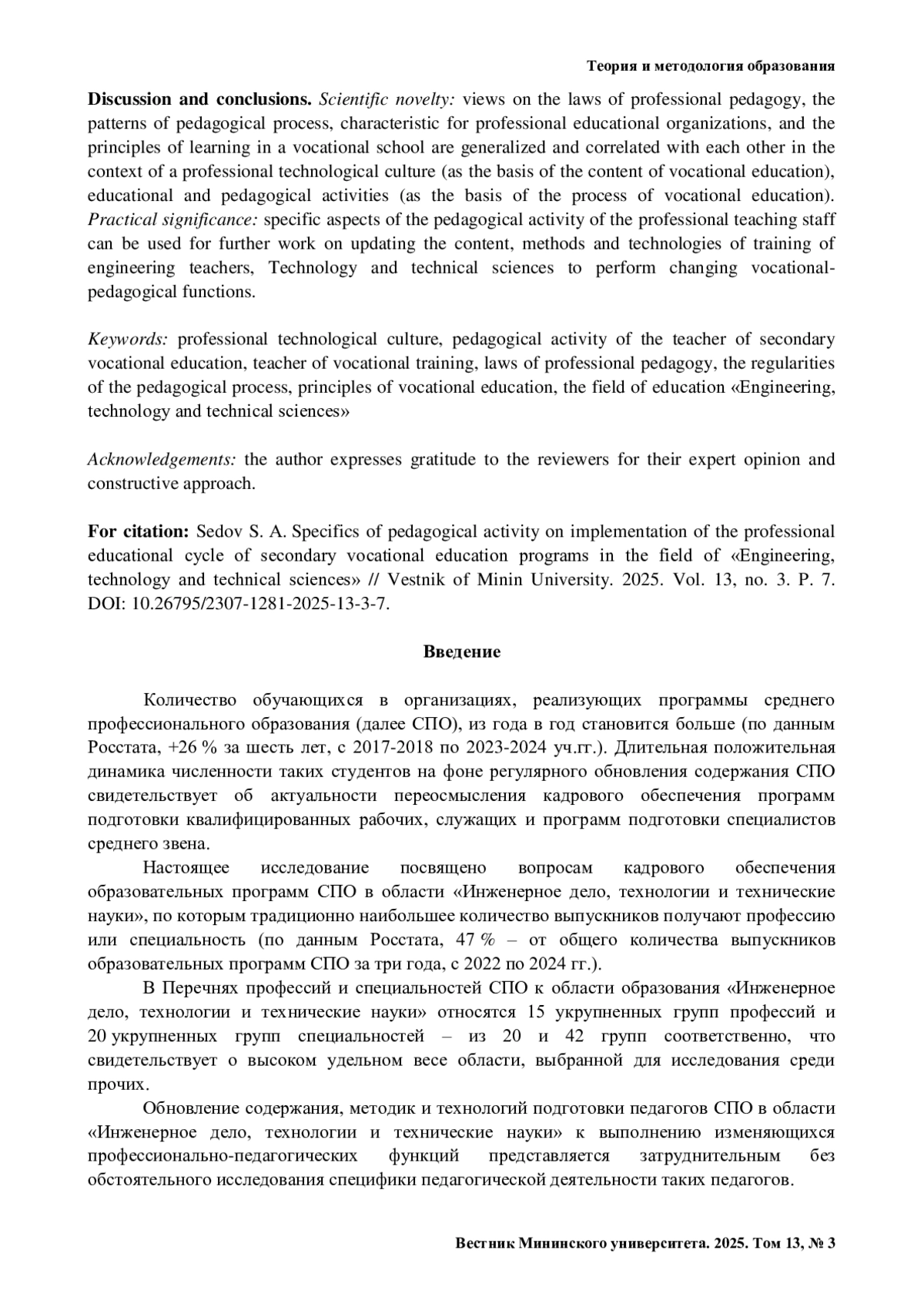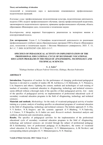 Введение. Подготовке педагогов к выполнению изменяющихся профессиональнопедагогических функций посвящен ряд исследований (М. М. Асильдерова, И. О. Елеференко, Е. В. Пискунова, И. Ю. Степанова и др.). Обновление содержания, методик и технологий такой подготовки педагогов СПО в области «Инженерное дело, технологии и технические науки» представляется затруднительным без обстоятельного исследования специфики педагогической деятельности.