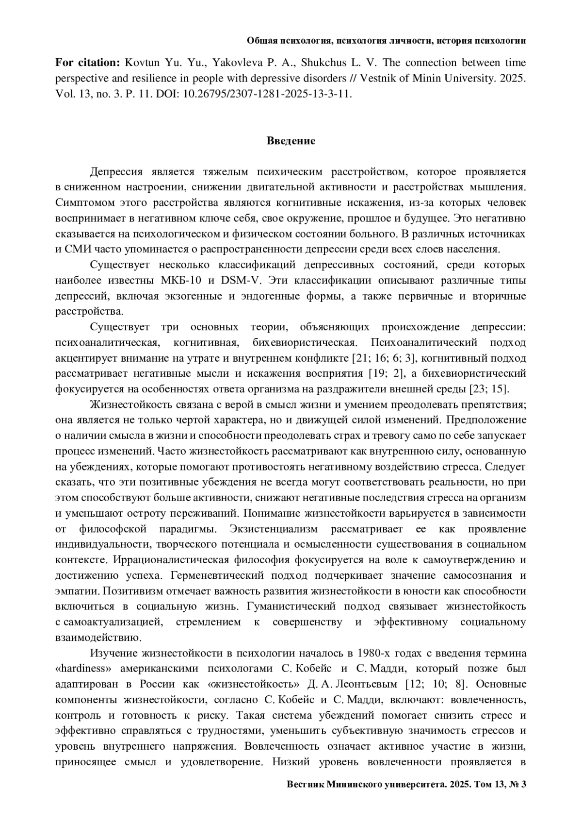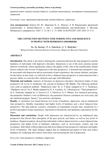 Введение. Статья посвящена изучению взаимосвязи временной перспективы и жизнестойкости у лиц с депрессивными расстройствами. Депрессия относится к числу наиболее распространенных психических заболеваний по всему миру, которое существенно снижает качество жизни. Одним из недостаточно изученных факторов, связанных с тяжестью протекания депрессии, является временная перспектива. Искажение временной перспективы может быть связано с депрессией и оценкой прошлого опыта, текущей ситуации и планов на будущее. В данном исследовании мы рассмотрим, как несбалансированная временная перспектива взаимосвязана со способностью человека преодолевать жизненные преграды и справляться с трудностями.