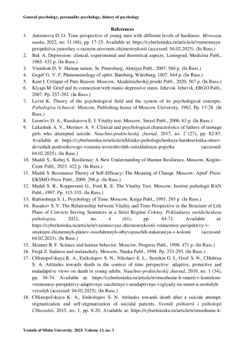 1. Анисимова Д. О. Временная перспектива юношей с разным уровнем жизнестойкости // Мировая наука. 2022. № 11 (68). С. 17-25. URL: https://cyberleninka.ru/article/n/vremennaya-perspektiva-yunoshey-s-raznym-urovnemzhiznestoykosti (дата обращения: 04.02.2025).