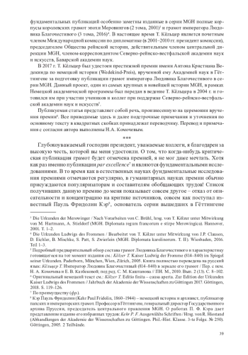 40. Kölzer T. Die Editionen der merowingischen Königsurkunden und Kaiser Ludwigs des Frommen // Quellenforschung im 21. Jahrhundert. Vorträge der Veranstaltungen zum 200-jährigen Bestehen der MGH vom 27. bis 29. Juni 2019. Wiesbaden, 2020 (MGH Schriften. Bd. 75). S. 3-24.