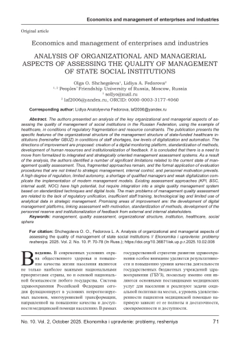 Авторы представили анализ ключевых организационно-управленческих аспектов оценки качества управления учреждениями социальной сферы в РФ, на примере здравоохранения, в условиях нормативной фрагментарности и ресурсных ограничений, в публикации представлены специфические особенности организационного построения структуры управления государственными бюджетными учреждениями здравоохранения (далее ГБУЗ) в условиях дефицита кадров, низкого уровня цифровизации и автоматизации. Предложены направления совершенствования: создание цифровой платформы мониторинга, стандартизация методик, развитие кадрового потенциала и институционализация обратной связи. Сделан вывод о необходимости перехода от формализованных к интегрированным и стратегически ориентированным системам оценки управления. В результате проведенного анализа авторами выявлены ряд существенные ограничения, связанные с текущим состоянием оценки качества управления. Так, сохраняется фрагментарность подходов, преобладает формальное применение оценочных процедур, не увязанных со стратегическим управлением, внутренним контролем и кадровой мотивацией. Высокая степень регламентации, ограниченная автономия, дефицит квалифицированных управленцев и слабая цифровизация - усложняет внедрение современных управленческих моделей. Существующие подходы к оценке (KPI, BSC, внутренний аудит, НОК) имеют высокий потенциал, но требуют интеграции в единую систему управления качеством на основе стандартизированных методик и цифровых инструментов. Основные проблемы оценки качества управления связаны с отсутствием нормативной унификации, недостаточной подготовкой кадров, технологическим отставанием и ограниченным использованием аналитических данных в стратегическом управлении. Перспективными направлениями совершенствования являются: развитие цифровых платформ управления, увязка оценки с мотивацией, стандартизация методик, развитие кадрового резерва и институционализация обратной связи с внешними и внутренними заинтересованными сторонами.