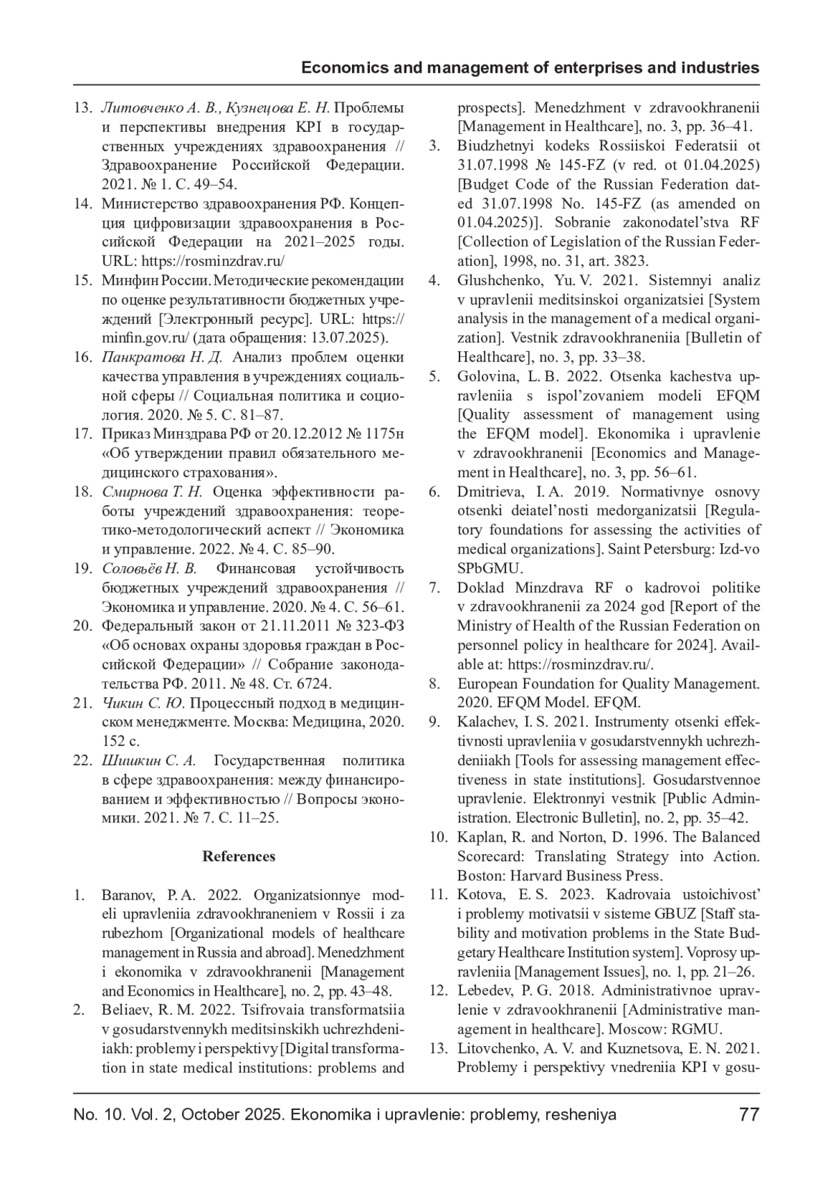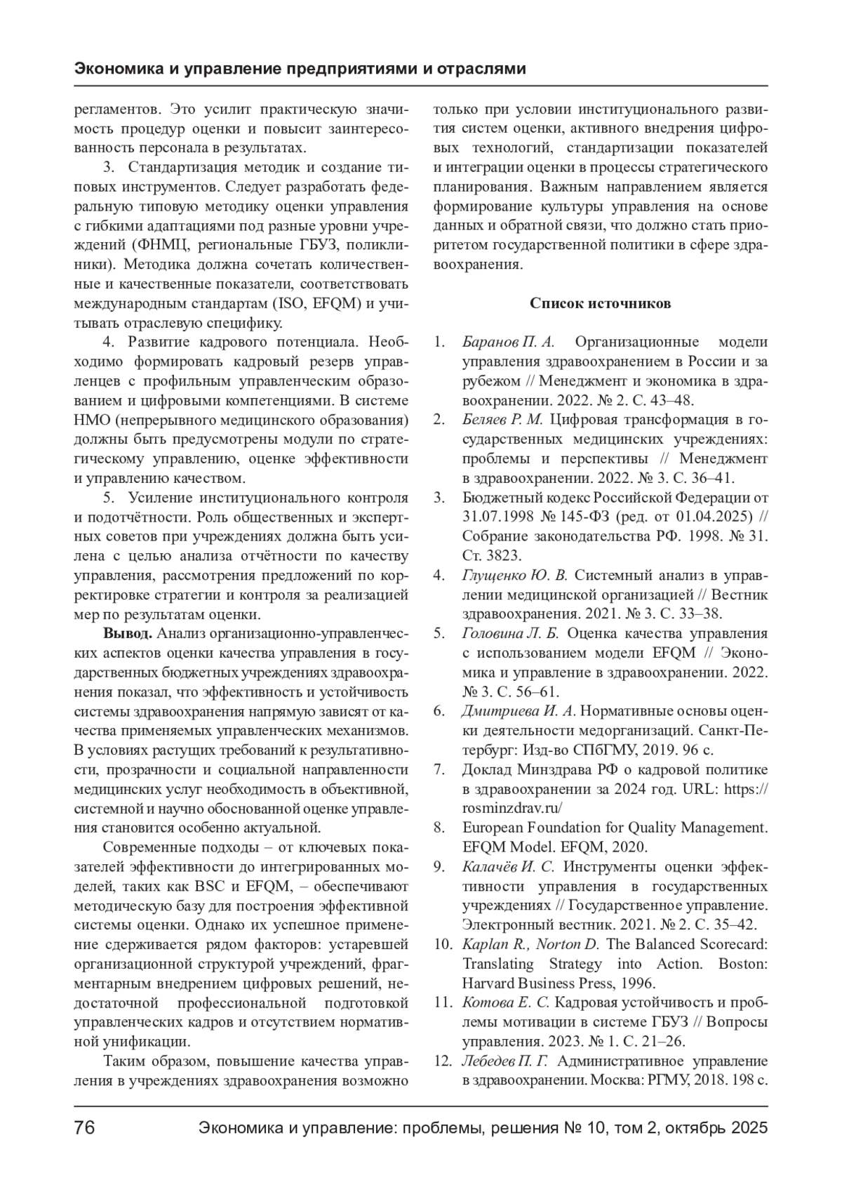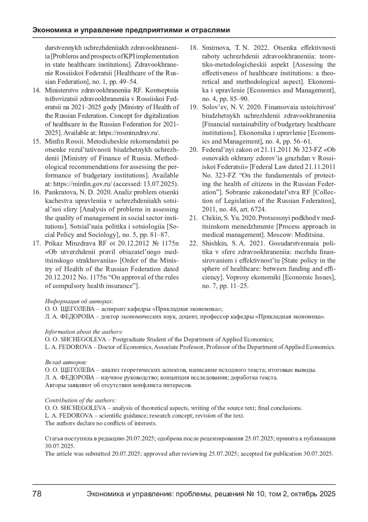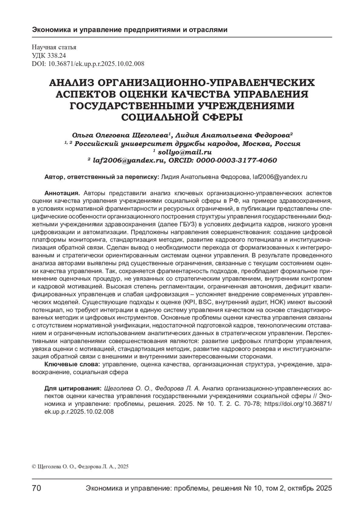 ЩЕГОЛЕВА О. О., ФЕДОРОВА Л. А. АНАЛИЗ ОРГАНИЗАЦИОННО-УПРАВЛЕНЧЕСКИХ АСПЕКТОВ ОЦЕНКИ КАЧЕСТВА УПРАВЛЕНИЯ ГОСУДАРСТВЕННЫМИ УЧРЕЖДЕНИЯМИ СОЦИАЛЬНОЙ СФЕРЫ // ЭКОНОМИКА И УПРАВЛЕНИЕ: ПРОБЛЕМЫ, РЕШЕНИЯ. 2025. ТОМ 2 № 10