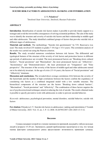 Введение. Определение факторов суицидального риска позволяет оказать своевременную поддержку подростку и избежать необратимых последствий решения экзистенциальных проблем. Цель исследования заключалась в выявлении структуры и степени выраженности факторов суицидального риска и их взаимосвязи у средних и старших подростков. В исследовании выявлены сочетанные группы факторов, провоцирующие суицидальный риск на разных этапах подросткового возраста. Материалы и методы. Использована методика «Опросник суицидального риска» Т. Н. Разуваевой. В исследовании приняли участие 235 учащихся 7-10 классов (Мвозраст = 15,4 лет). Корреляционный анализ результатов осуществлен с помощью критерия Пирсона. Результаты исследования. В исследовании выявлены многочисленные взаимосвязи между факторами риска. Выявлены дифференциальные и типологические особенности структуры выраженности факторов риска и факторов защиты в разные возрастные периоды подросткового возраста. Наиболее выражены факторы «Слом культурных барьеров», «Социальный пессимизм» и «Максимализм», группу средне выраженных факторов составили «Аффективность», «Несостоятельность» и «Демонстративность», наименее выражены «Уникальность» и «Временная перспектива». Структура выраженности факторов подростков среднего и старшего возраста оказалась относительно инвариантной. В кризисном возрасте (13-14 лет) доминируют факторы «Социальный пессимизм» и «Аффективность». Обсуждение и заключения. Обнаруженные прямые средние взаимосвязи (0,6) между степенью выраженности фактора/рангом и числом высоких взаимосвязей между факторами подтверждают целесообразность рассмотрения факторов риска в качестве сочетанной интегрированной модели с низковариативной структурой. Иерархические компоненты структуры составляют факторы «Слом культурных барьеров», «Максимализм», «Социальный пессимизм» и «Аффективность». Сочетание этих факторов требует применения психокоррекционных приемов, направленных на снижение суицидального риска. Полученные результаты позволяют конкретизировать профилактическую работу с подростками с целью превенции суицидального поведения.