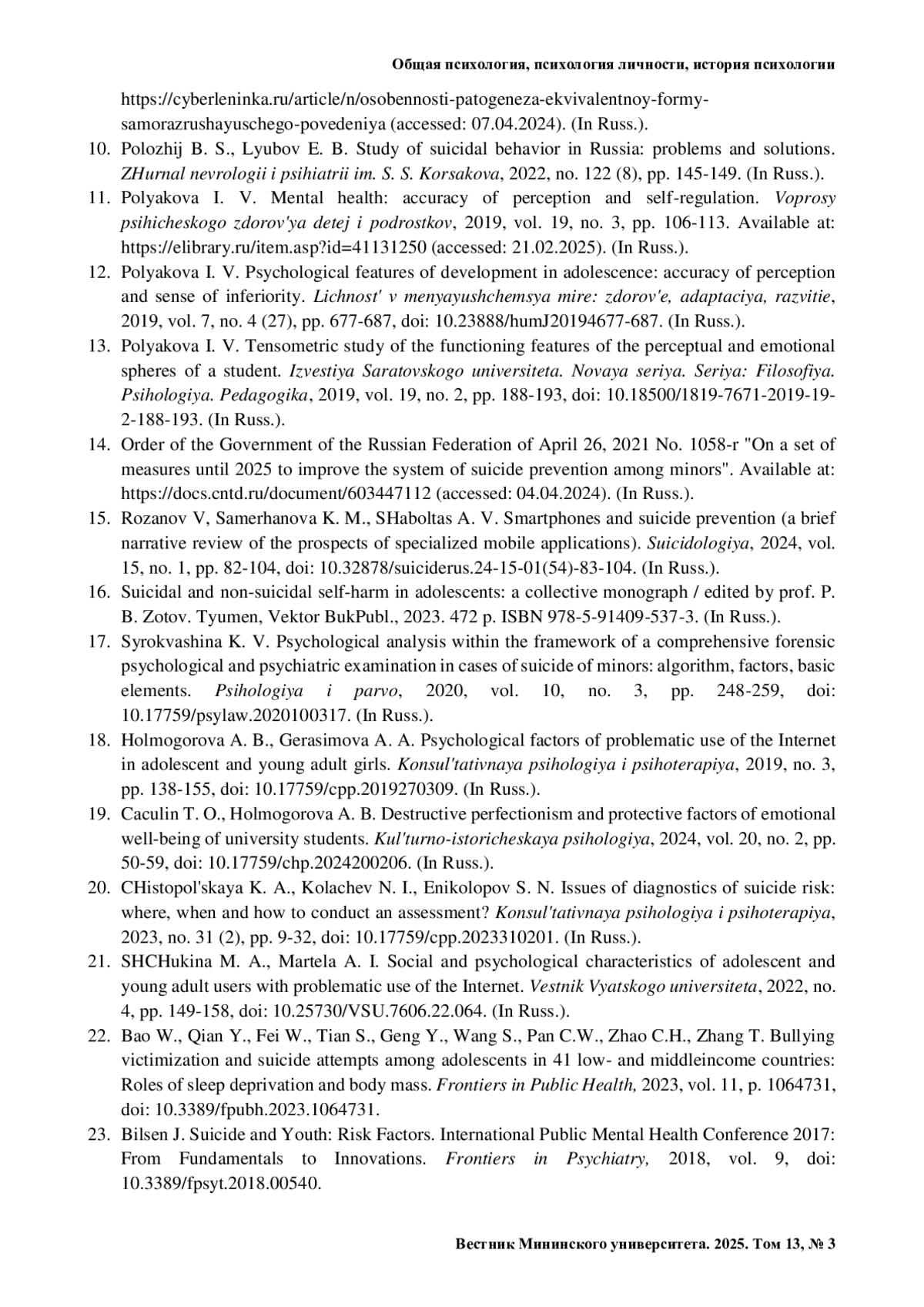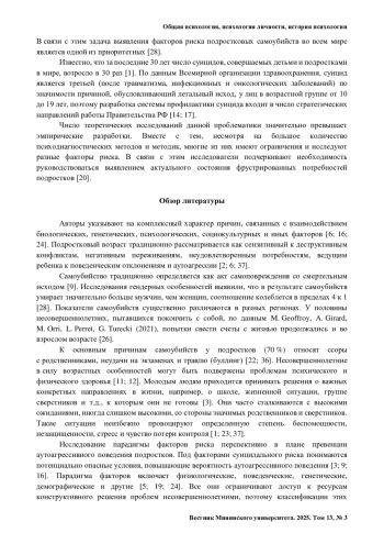 10. Положий Б. С., Любов Е. Б. Изучение суицидального поведения в России: проблемы и решения // Журнал неврологии и психиатрии им. С. С. Корсакова. 2022. № 122 (8). С. 145- 149.