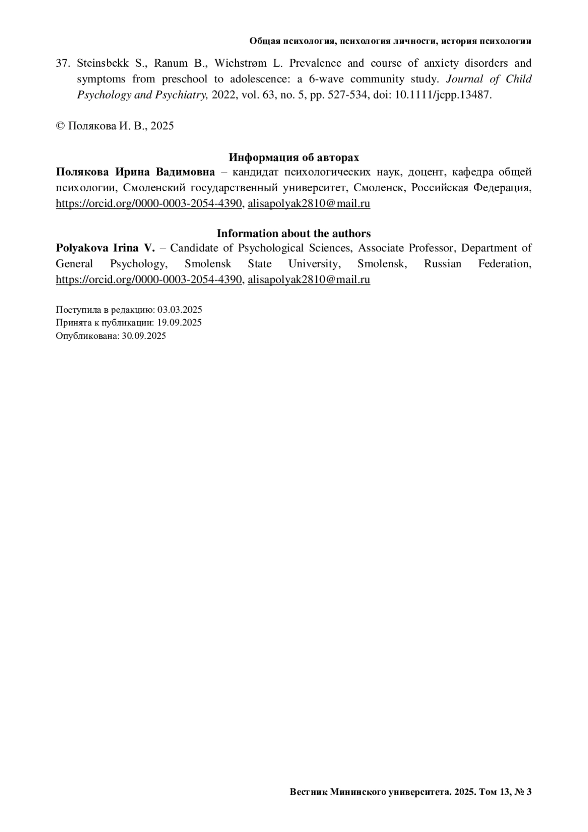 12. Полякова И. В. Психологические особенности развития в юношеском возрасте: точность восприятия и чувство неполноценности // Личность в меняющемся мире: здоровье, адаптация, развитие. 2019. Т. 7, № 4 (27). С. 677-687. https://doi.org/10.23888/humJ20194677-687.