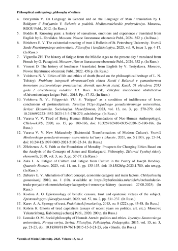 10. Волохова Н. В., Филиппович Ю. С. «Усталость» как условие индифферентности любви: выводы постмодерна // Известия Юго-Западного государственного университета. Серия: Экономика. Социология. Менеджмент. 2023. Т. 13, № 3. С. 270-279. https://doi.org/10.21869/2223-1552-2023-13-3-270-279. EDN HHSBYC.