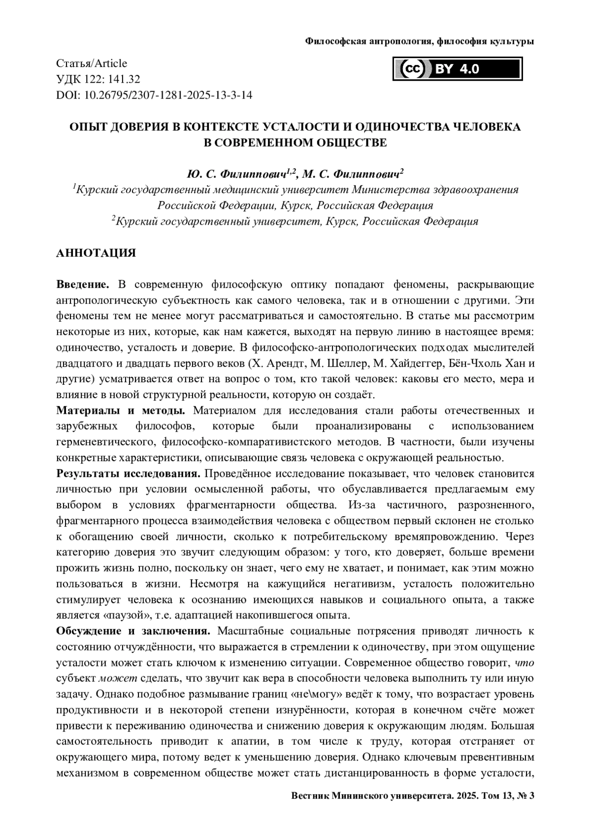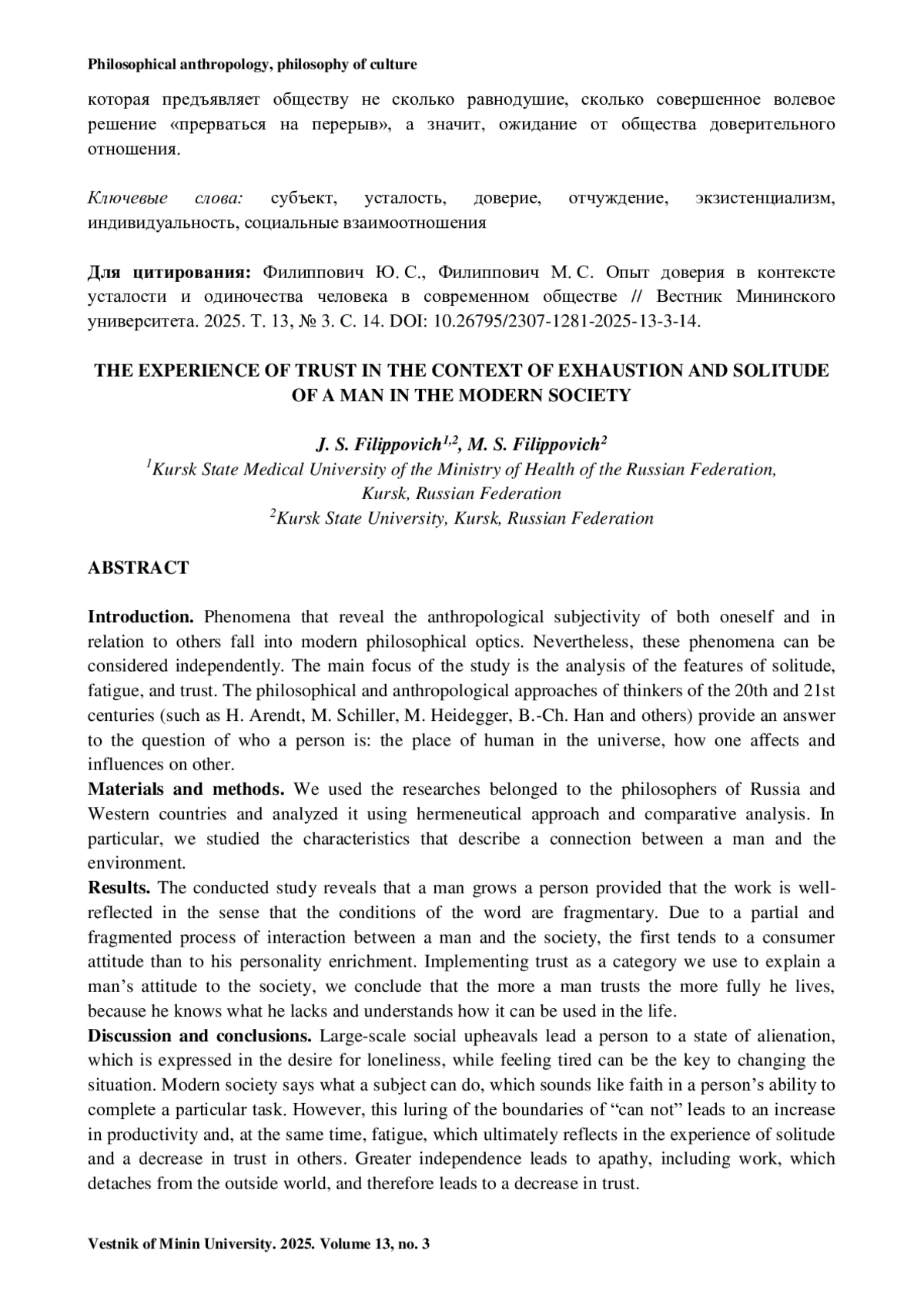 Введение. В современную философскую оптику попадают феномены, раскрывающие антропологическую субъектность как самого человека, так и в отношении с другими. Эти феномены тем не менее могут рассматриваться и самостоятельно. В статье мы рассмотрим некоторые из них, которые, как нам кажется, выходят на первую линию в настоящее время: одиночество, усталость и доверие. В философско-антропологических подходах мыслителей двадцатого и двадцать первого веков (Х. Арендт, М. Шеллер, М. Хайдеггер, Бён-Чхоль Хан и другие) усматривается ответ на вопрос о том, кто такой человек: каковы его место, мера и влияние в новой структурной реальности, которую он создаёт. Материалы и методы. Материалом для исследования стали работы отечественных и зарубежных философов, которые были проанализированы с использованием герменевтического, философско-компаративистского методов. В частности, были изучены конкретные характеристики, описывающие связь человека с окружающей реальностью. Результаты исследования. Проведённое исследование показывает, что человек становится личностью при условии осмысленной работы, что обуславливается предлагаемым ему выбором в условиях фрагментарности общества. Из-за частичного, разрозненного, фрагментарного процесса взаимодействия человека с обществом первый склонен не столько к обогащению своей личности, сколько к потребительскому времяпровождению. Через категорию доверия это звучит следующим образом: у того, кто доверяет, больше времени прожить жизнь полно, поскольку он знает, чего ему не хватает, и понимает, как этим можно пользоваться в жизни. Несмотря на кажущийся негативизм, усталость положительно стимулирует человека к осознанию имеющихся навыков и социального опыта, а также является «паузой», т. е. адаптацией накопившегося опыта. Обсуждение и заключения. Масштабные социальные потрясения приводят личность к состоянию отчуждённости, что выражается в стремлении к одиночеству, при этом ощущение усталости может стать ключом к изменению ситуации. Современное общество говорит, что субъект может сделать, что звучит как вера в способности человека выполнить ту или иную задачу. Однако подобное размывание границ «не\могу» ведёт к тому, что возрастает уровень продуктивности и в некоторой степени изнурённости, которая в конечном счёте может привести к переживанию одиночества и снижению доверия к окружающим людям. Большая самостоятельность приводит к апатии, в том числе к труду, которая отстраняет от окружающего мира, потому ведет к уменьшению доверия. Однако ключевым превентивным механизмом в современном обществе может стать дистанцированность в форме усталости, которая предъявляет обществу не сколько равнодушие, сколько совершенное волевое решение «прерваться на перерыв», а значит, ожидание от общества доверительного отношения.