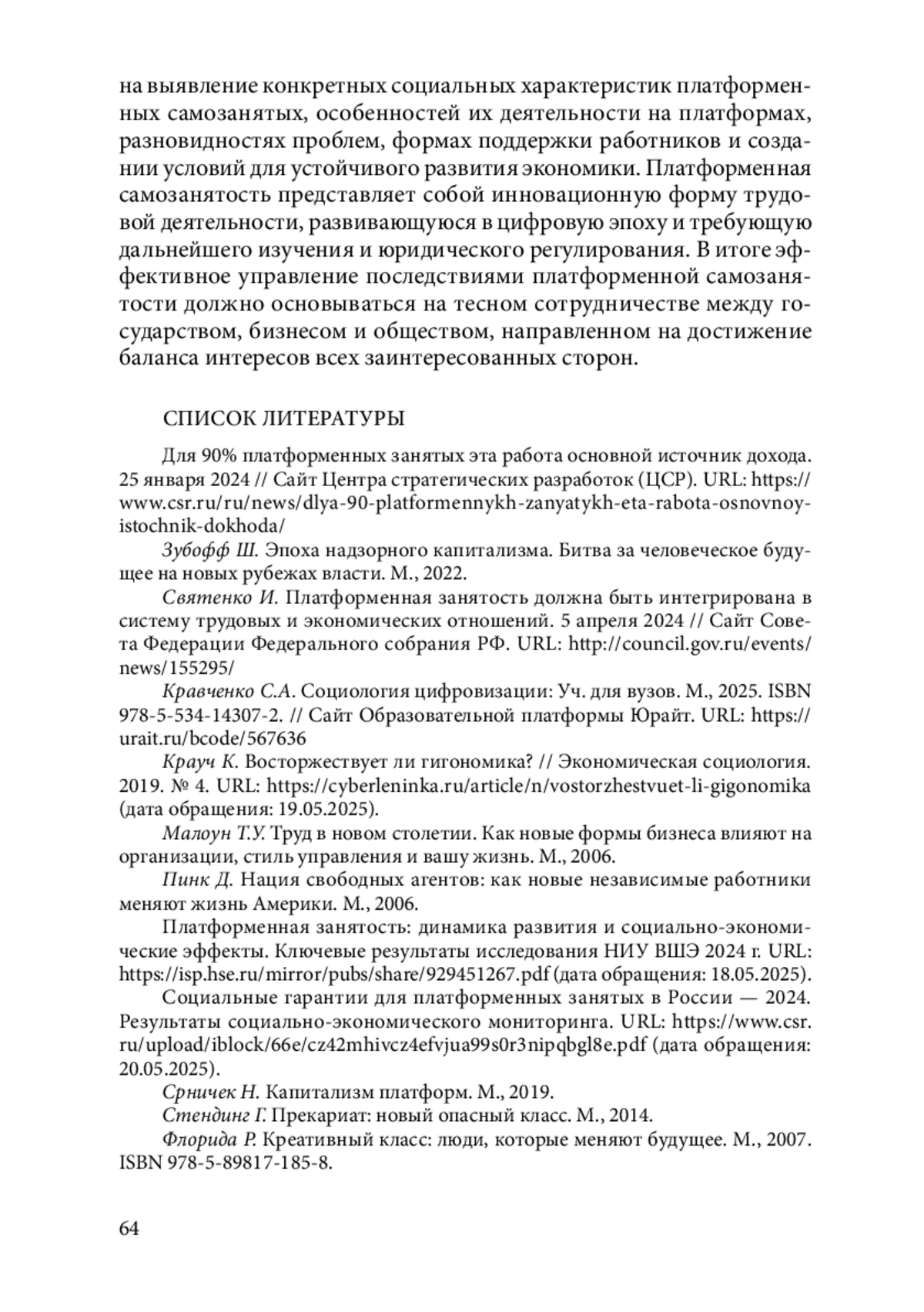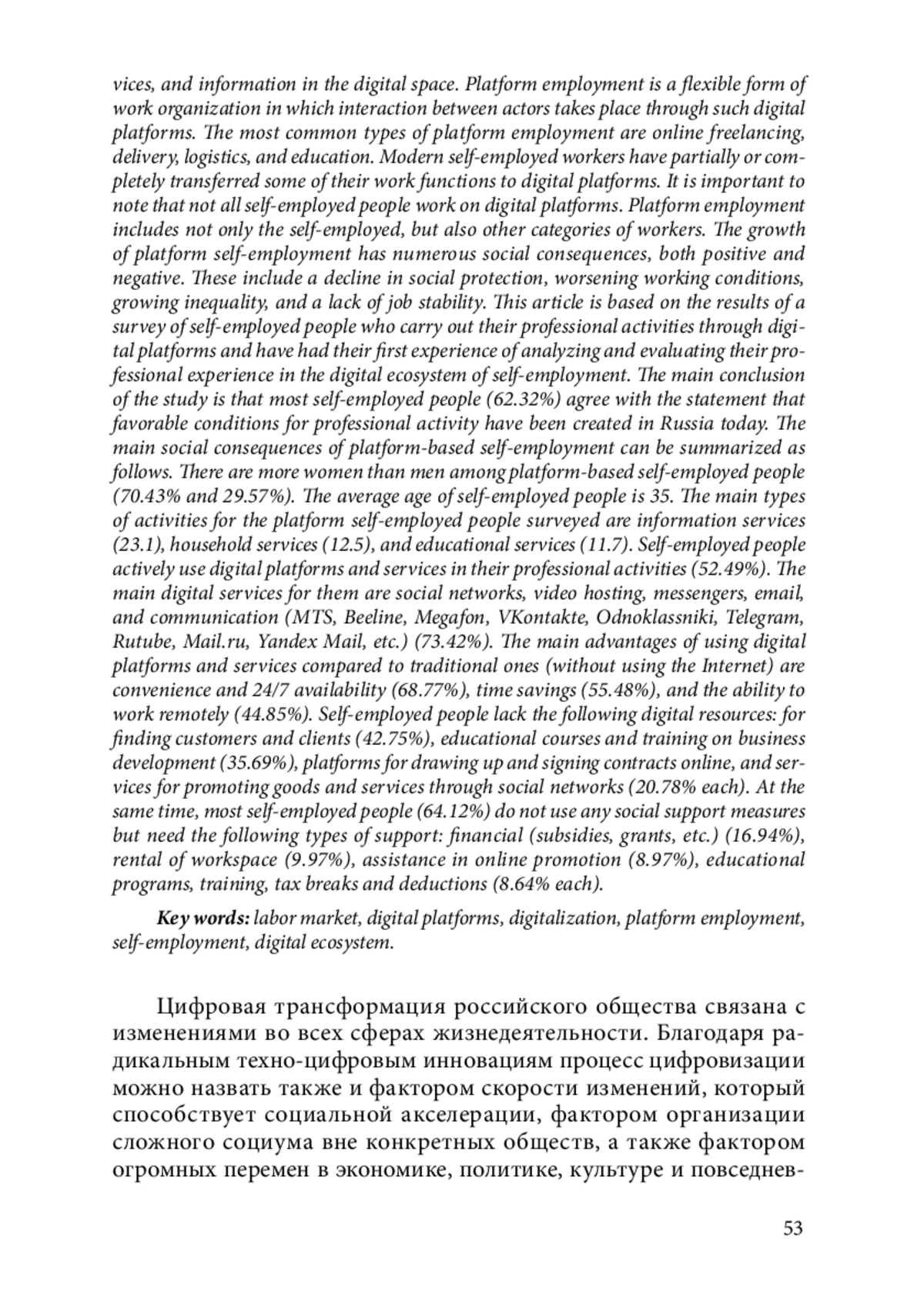 Современный рынок труда трансформируется под воздействием ускоренного развития цифровых технологий и внедрения цифровых платформ. Цифровая платформа представляет собой информационную систему, объединяющую различные типы акторов (представители государственных органов, коммерческих и некоммерческих организаций, физические лица и др.) и позволяющую им обмениваться цифровыми продуктами, услугами и информацией в цифровом пространстве. Платформенная занятость представляет собой гибкую форму организации труда, при которой взаимодействие между акторами осуществляется через такие цифровые платформы. Наиболее распространенными видами платформенной занятости являются онлайн-фриланс, доставка, логистика и образование. Современные самозанятые частично или полностью перенесли часть своих трудовых функций на цифровые платформы. Важно отметить, что не все самозанятые трудятся на цифровых платформах. И в платформенную занятость включены не только самозанятые, но и другие категории работников. Рост платформенной самозанятости влечет за собой многочисленные социальные последствия: как положительные, так и отрицательные. Среди них: снижение уровня социальной защиты, ухудшение условий труда, рост неравенства и отсутствие стабильности труда. Данная статья основана на результатах опроса тех самозанятых, кто осуществляет свою профессиональную деятельность через цифровые платформы и столкнулся с первым опытом анализа и оценки опыта своей профессиональной деятельности на цифровой экосистеме самозанятости. Главный вывод исследования: большинство самозанятых согласны (62,32%) с утверждением, что сегодня в России созданы благоприятные условия осуществления профессиональной деятельности. Основными социальными последствиями платформенной самозанятости можно назвать следующие. Среди платформенных самозанятых женщин больше, чем мужчин (70,43% и 29,57%). Средний возраст самозанятых — 35 лет. Основными видами деятельности для опрошенных платформенных самозанятых являются: информационные услуги (23,1), бытовые (12,5) и образовательные (11,7). Самозанятые активно пользуются цифровыми платформами и сервисами в своей профессиональной деятельности (52,49%). Основными цифровыми сервисами для них являются соцсети, видеохостинги, мессенджеры, почта, связь (приложения МТС, “Билайн”, “Мегафон”, “ВКонтакте”, “Одноклассники”, Telegram, Rutube, “Почта Mail. ru”, “Яндекс почта” и др.) (73,42%). Главными преимуществами в использовании цифровых платформ и сервисов по сравнению с традиционными (без использования интернета) названы: удобство и доступность 24/7 (68,77%), экономия времени (55,48%), возможность работы удаленно (44,85%). Самозанятым не хватает следующих цифровых ресурсов: для поиска заказчиков и клиентов (42,75%), образовательных курсов и тренингов по развитию своего дела (35,69%), платформ для оформления и подписания договоров онлайн и сервисов для продвижения товаров и услуг через социальные сети (по 20,78%). При этом, большинство самозанятых (64,12%) не пользуются никакими мерами социальной поддержки, но нуждаются в следующих видах поддержки: финансовой (субсидии, гранты и др.) (16,94%), в аренде рабочего пространства (9,97%), содействии в продвижении в интернете (8,97%), в образовательных программах, в тренингах, налоговых льготах и вычетах (по 8,64%).