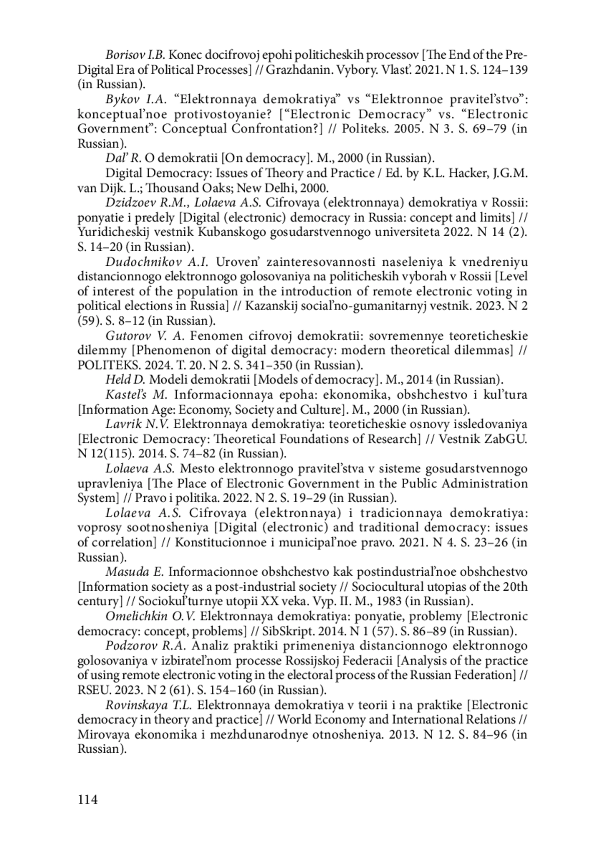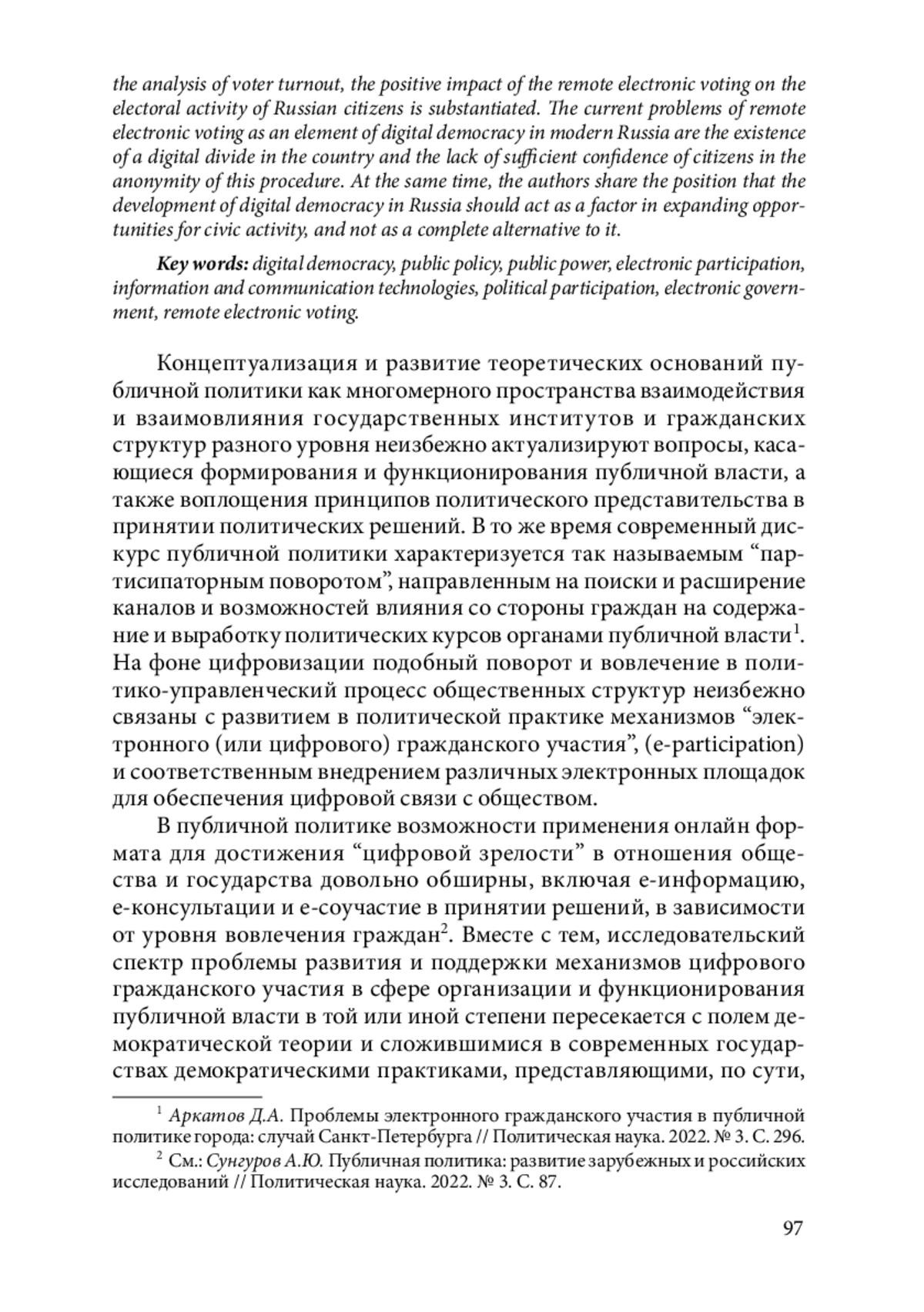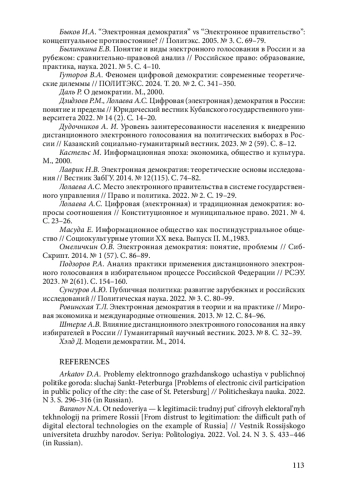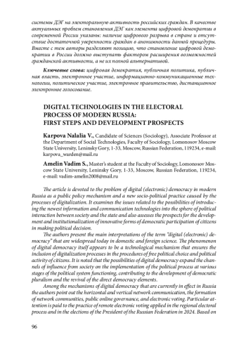 Статья посвящена проблеме становления цифровой (электронной) демократии в современной России как механизма публичной политики и новой социально-политической практики, обусловленной процессами цифровизации. Рассматриваются вопросы, затрагивающие возможности внедрения новейших информационно-коммуникационных технологий в сферу политического взаимодействия между обществом и государством, а также оцениваются перспективы развития и институционализации инновационных форм демократического участия граждан в принятии политических решений. Авторами приведены распространенные на сегодняшний день в отечественной и зарубежной науке основные трактовки термина “цифровая (электронная) демократия”. Сам феномен цифровой демократии представляется технологическим механизмом, обеспечивающим включение процессов цифровизации в процедуры свободного политического выбора и политической активности граждан. Отмечается, что возможности цифровой демократии расширяют каналы влияния со стороны общества на реализацию политического процесса на различных стадиях функционирования социально-политической системы, способствуя развитию демократического плюрализма и возрождению элементов прямой демократии. К числу действующих в настоящее время механизмов цифровой демократии в России авторы относят горизонтальную и вертикальную сетевую коммуникацию, формирование сетевых сообществ, общественное онлайнуправление, электронное голосование. Особое внимание уделено практике дистанционного электронного голосования (ДЭГ), примененной в региональном избирательном процессе и на выборах Президента Российской Федерации в 2024 г. На основании анализа явки избирателей обосновано положительное влияние системы ДЭГ на электоральную активность российских граждан. В качестве актуальных проблем становления ДЭГ как элемента цифровой демократии в современной России указаны: наличие цифрового разрыва в стране и отсутствие достаточной уверенности граждан в анонимности данной процедуры. Вместе с тем авторы разделяют позицию, что становление цифровой демократии в России должно выступать фактором расширения возможностей гражданской активности, а не их полной альтернативой.