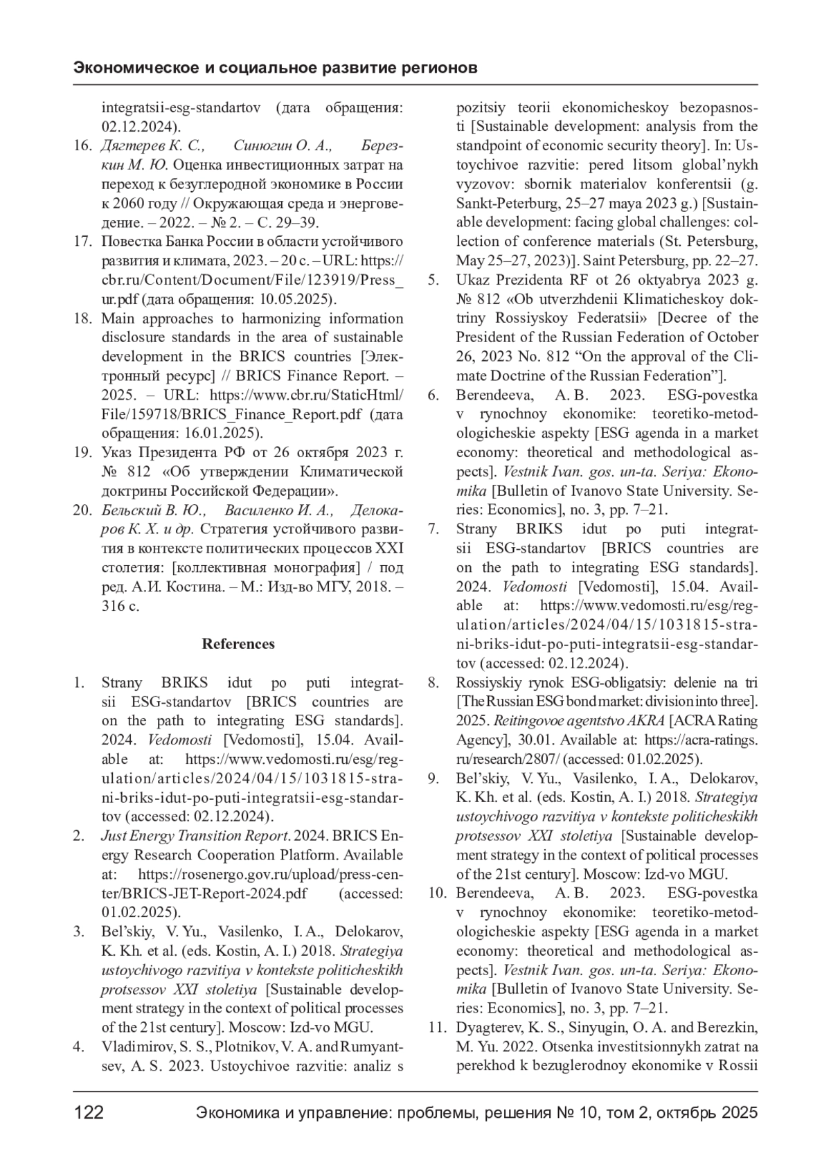 10. Берендеева А. Б. ESG-повестка в рыночной экономике: теоретико-методологические аспекты // Вестник Иван. гос. ун-та. Серия: Экономика. - 2023. - № 3. - С. 7-21. - URL:http://ivanovo.ac.ru/about_the_university/science/magazines/herald/economics.php (дата обращения: 10.05.2025).