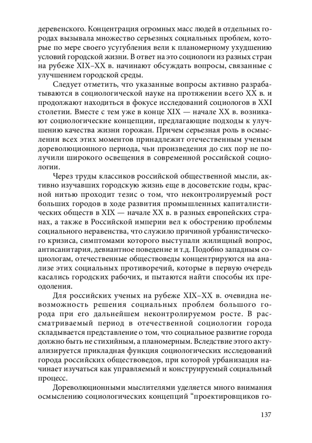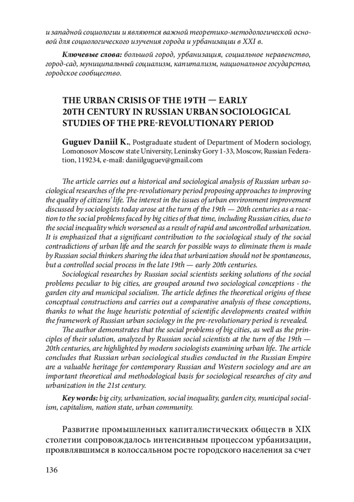 В настоящей статье осуществляется историко-социологический анализ отечественных социологических исследований города дореволюционного периода, формирующих подходы к повышению качества жизни горожан. Интерес к вопросам улучшения городской среды, активно обсуждаемым социологами сегодня, возникает еще на рубеже XIX–XX в. как реакция на социальные проблемы больших городов того времени, в том числе российских, которые были обусловлены социальным неравенством, обострившимся в результате стремительной и неуправляемой урбанизации. Подчеркивается, что значимый вклад в социологическое изучение социальных противоречий городской жизни и поиск возможных путей их устранения вносят российские социальные мыслители, которые в конце XIX — начале XX столетия разделяют идею о том, что урбанизация должна быть не стихийным, а контролируемым и созидаемым социальным процессом. Социологические исследования российских обществоведов, стремившихся в досоветские годы выработать методы решения социальных проблем, присущих большим городам, группируются вокруг двух социологических концепций — города-сада и муниципального социализма. В статье определяются теоретические истоки этих концептуальных построений, а также производится сравнительный анализ последних, благодаря чему выявляется огромный эвристический потенциал научных разработок, созданных в рамках отечественной социологии города в дореволюционный период. Автор демонстрирует, что социальные проблемы больших городов, а также принципы их решения, анализируемые российскими обществоведами на рубеже XIX–XX в., освещаются в творчестве современных социологов, занимающихся осмыслением городской жизни. В статье делается вывод о том, что отечественные социологические исследования города, проведенные во времена Российской империи, сегодня представляют большую ценность для российской и западной социологии и являются важной теоретико-методологической основой для социологического изучения города и урбанизации в XXI в.