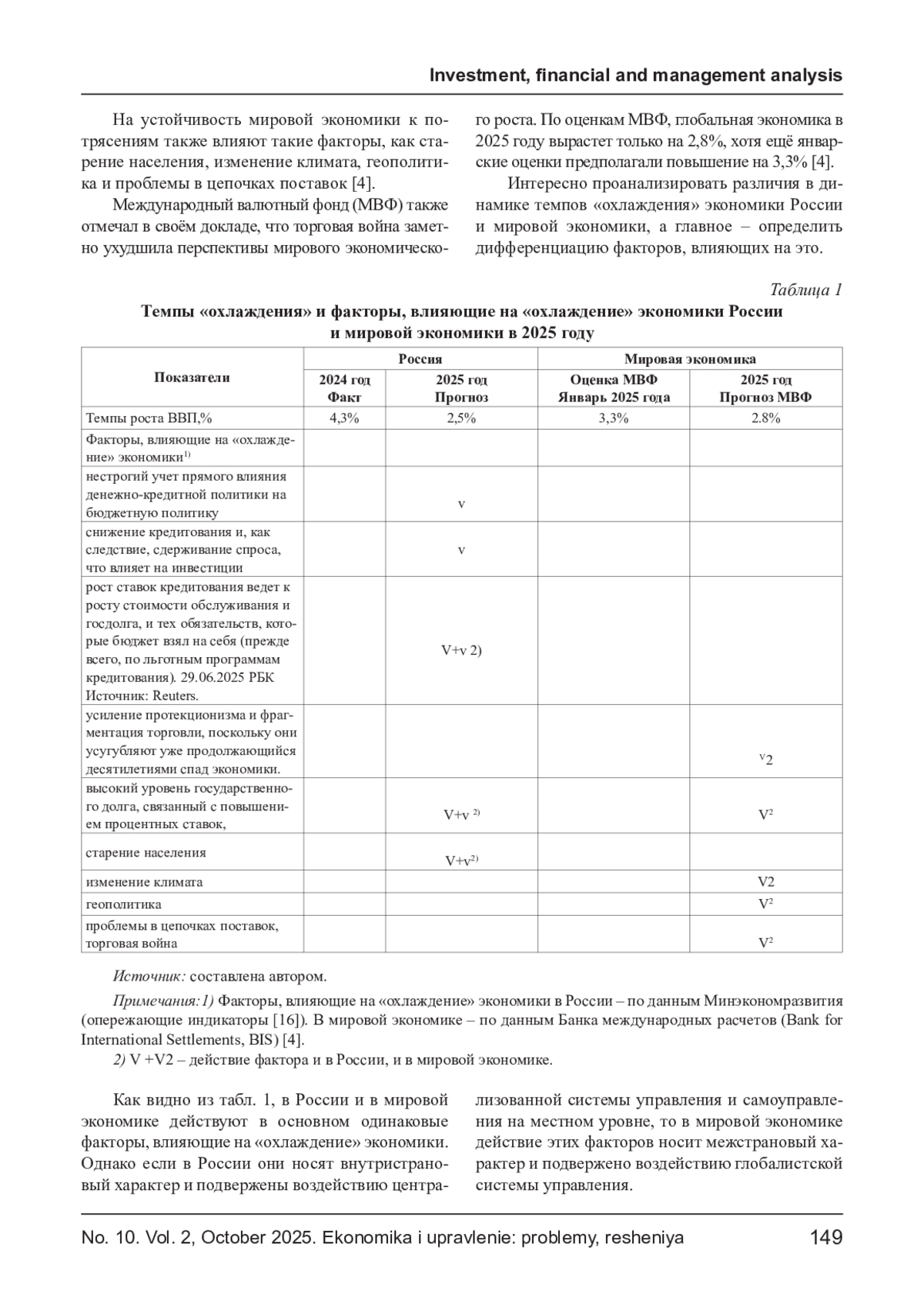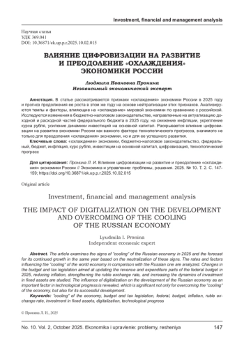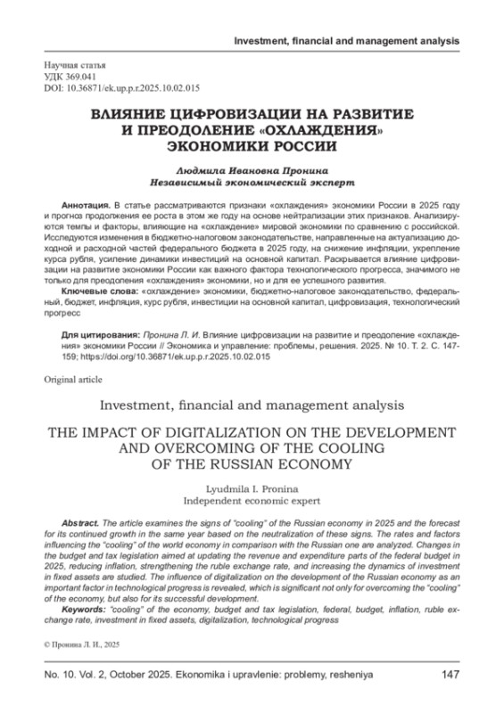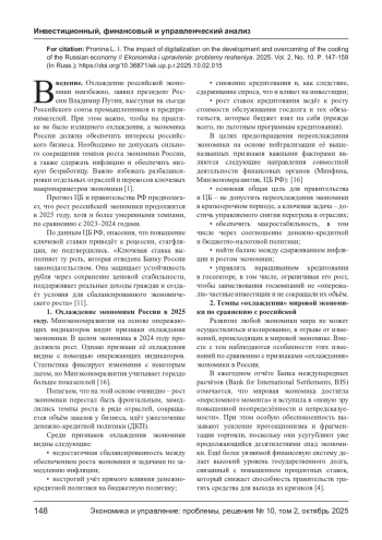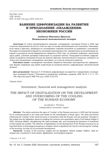 В статье рассматриваются признаки «охлаждения» экономики России в 2025 году и прогноз продолжения ее роста в этом же году на основе нейтрализации этих признаков. Анализируются темпы и факторы, влияющие на «охлаждение» мировой экономики по сравнению с российской. Исследуются изменения в бюджетно-налоговом законодательстве, направленные на актуализацию доходной и расходной частей федерального бюджета в 2025 году, на снижение инфляции, укрепление курса рубля, усиление динамики инвестиций на основной капитал. Раскрывается влияние цифровизации на развитие экономики России как важного фактора технологического прогресса, значимого не только для преодоления «охлаждения» экономики, но и для ее успешного развития.